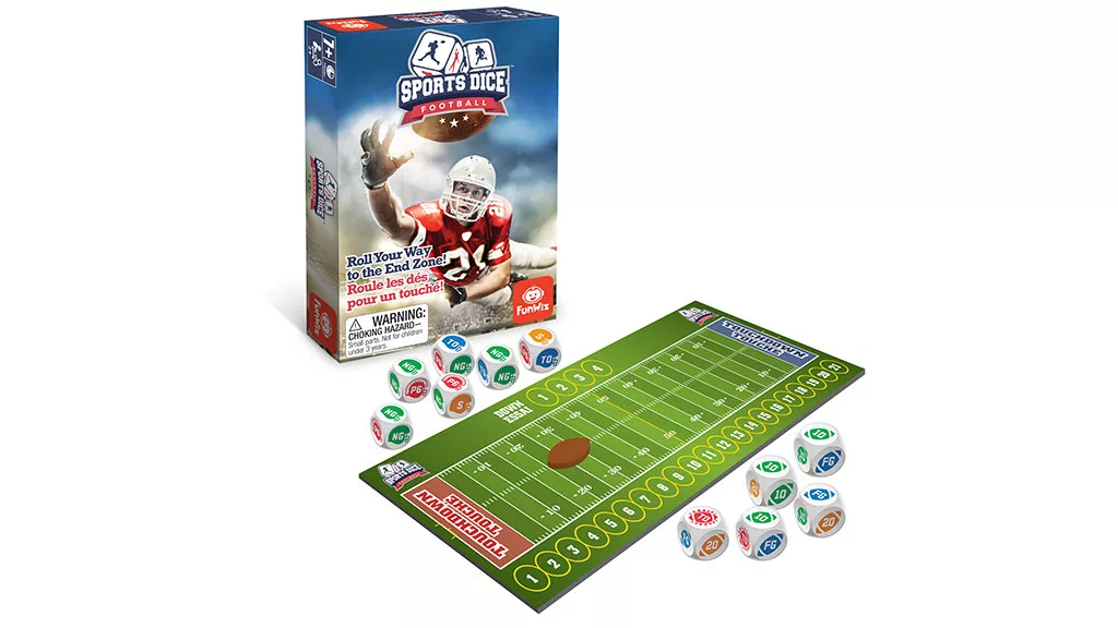 Táto klasická hra UNO sa dá hrať s obrovskými, nadrozmernými kartami, na ktorých sú obrázky tímov NFL. Špeciálne pravidlo Ice the Kicker núti hráčov kopať field gól s papierovým futbalom cez bránu vytvorenú rukami iného hráča.Vrhnite sa do akcie s touto ľahko naučiteľnou a rýchlo hrateľnou kockovou hrou. Všetka dráma je tu, ako pri skutočnom zápase. Choďte na štvrtý pokus a dosiahnite touchdown v záujme cieľovej oblasti. Potom sa pokúste zastaviť súperov tím tým, že zložíte ich quarterbacka.