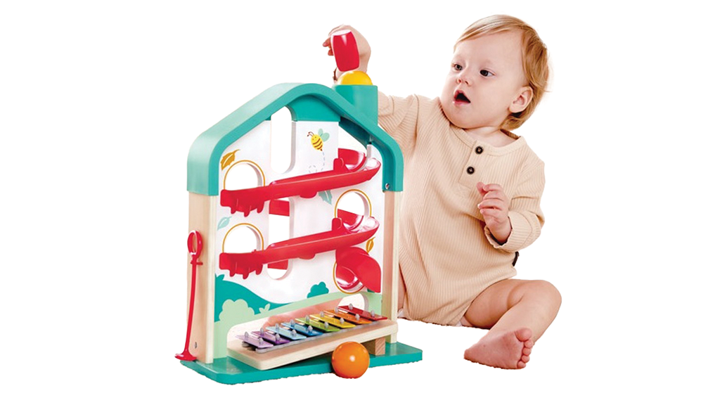 Deti sa môžu ponoriť do multifunkčnej hry s touto hračkárskou sadou. Ako batolatá udierajú drevené gule na vrchu cez komín, aby sa skĺzli po zvlnenej dráhe a prešli cez farebné tóny xilofónu, môžu objavovať základné hudobné pojmy. Sada obsahuje dve gule, odnímateľný xilofón a paličku.