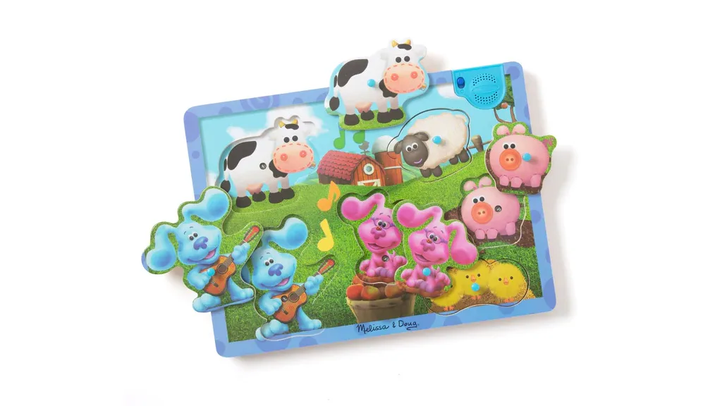 Deti môžu odstrániť rôzne diely puzzle, aby si vypočuli časti piesne "Old MacDonald Had a Farm!". Nájdete tu šesť drevených dielov, na ktorých sú zobrazené dobre známe postavy z Blues Clues & You!