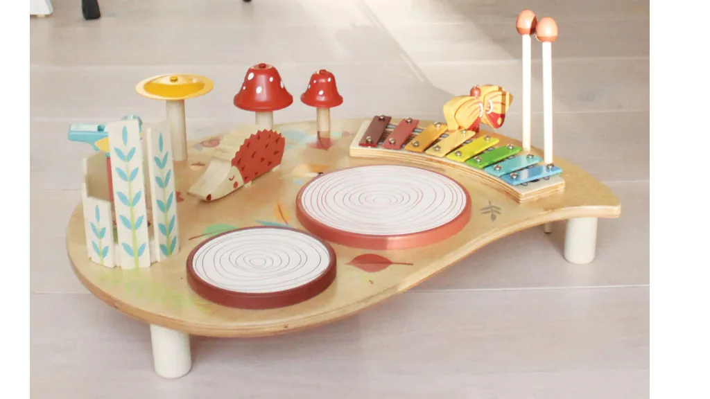 Tento drevený stôl obsahuje farebný xylofón, gombíkové zvončeky, drevené trupové bubny, gaštanové búchačky, vtáčie píšťalky a drevený zvon. Deti navyše môžu cvaknúť krídelkami a prejsť gaštanovou búchačkou po chrbte diviaka!
