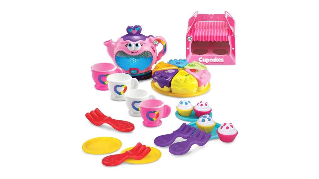 Zorganizuj si imaginárne popoludnie plné hudby s čajom! Táto 25-dielna sada obsahuje čajník, štyri šálky na čaj, vidličky, tanieriky, štyri cupcake, krabičku na cupcake, šesť kusov plastového koláča a misu na koláč. Čajník hrá rôzne piesne, keď sa s ním deti hrajú.