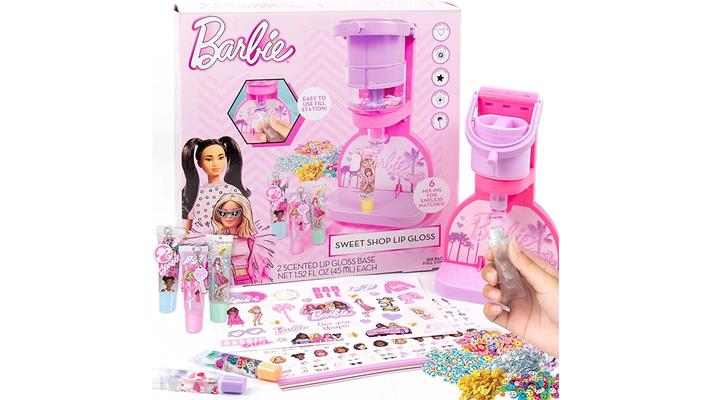 Priprav si 12 jahodovo voňavých leskov na pery súpravou Barbie Sweet Shop Lip Gloss! Inovatívny prístroj na výrobu leskov na pery uľahčuje výrobu leskov na pery — je to náplňová stanica, ktorú môžu deti používať znova a znova!