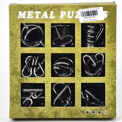 Kovové hlavolamy sú špeciálne tvary zložené zo silného drôtu, ktoré majú vlastný spôsob spájania, viazania alebo dokonca oddeľovania dvoch zodpovedajúcich párov. V tejto sérii je deväť rôznych dielikov, s ktorými sa môžu otestovať deti alebo dospelí. Môžu otestovať svoju logiku a obratnosť. Táto hračka nie v každom prípade vyžaduje použitie sily, takže v tomto prípade je platné tvrdenie: viac rozumom ako silou.