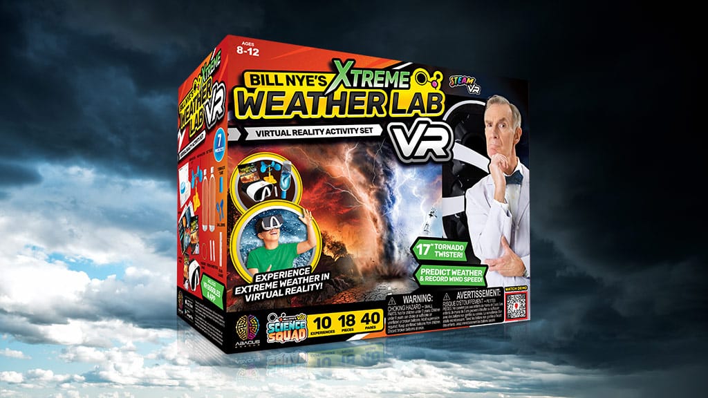 Bill Nye Extrémne počasie laboratórium VR pre deti je zábavný spôsob, ako sa oboznámiť s prírodnými katastrofami a ich fungovaním. Učebné dobrodružstvo pozostáva z troch častí: spoznávanie prírodných katastrof pomocou priloženého sprievodcu, vykonávanie experimentov s pomocou priložených nástrojov a tabuliek a zažívanie prírodných katastrof vo virtuálnej realite (VR)! Na prístup k VR prvkom sady si deti musia stiahnuť aplikáciu Bill Nye VR Science Squad na telefón alebo podobné zariadenie. Potom pomocou aktivačného kódu uvedeného v sprievodcovi môžu deti odomknúť segment Xtreme Weather VR. Deti môžu buď vložiť telefón do priloženého VR headsetu, aby zažili búrky, lavíny a iné katastrofy vo virtuálnej realite, alebo môžu zdieľať zážitok s priateľmi v režime celej obrazovky.