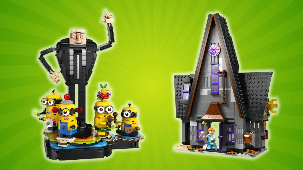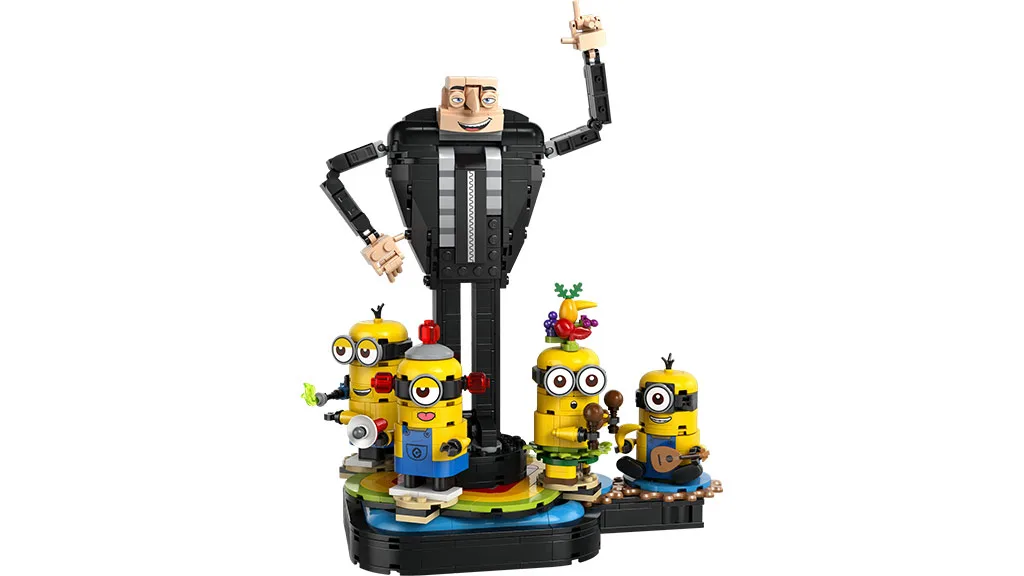 LEGO Gru 4 Minionov a rodinná dobrodružstvá Grua, ktoré je určené pre deti od 8 rokov a staršie, obsahuje 868 dielikov a má šikmú strechu a živú farbu dreveného domčeka. LEGO Tehlová stavba Gru, ktorá obsahuje 839 dielikov a je určená pre deti od 9 rokov a staršie, zobrazuje Grua obklopeného tancujúcimi Minionmi, vrátane Mela, ktorý hrá na ukulele, a Kevina, ktorý je vybavený prdipuškou.