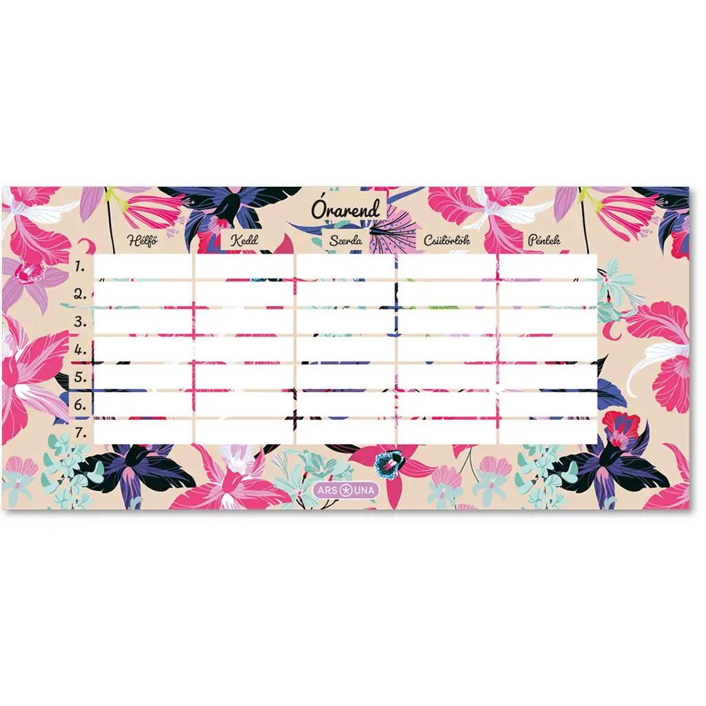 Rozkvitnutý rozvrh na každý školský týždeň! Rozvrh hodín Beach Flowers od Ars Una je skutočne štýlový kúsok, ktorý nie je len praktický, ale aj oku lahodiaci. Kvetinový dizajn s elegantnými pastelovými odtieňmi a bohatou farebnou škálou zdobí prehľadné rozvrhnutie od pondelka do piatku, takže je ideálnou voľbou pre každého, kto má rád módne a farebné doplnky pri učení.