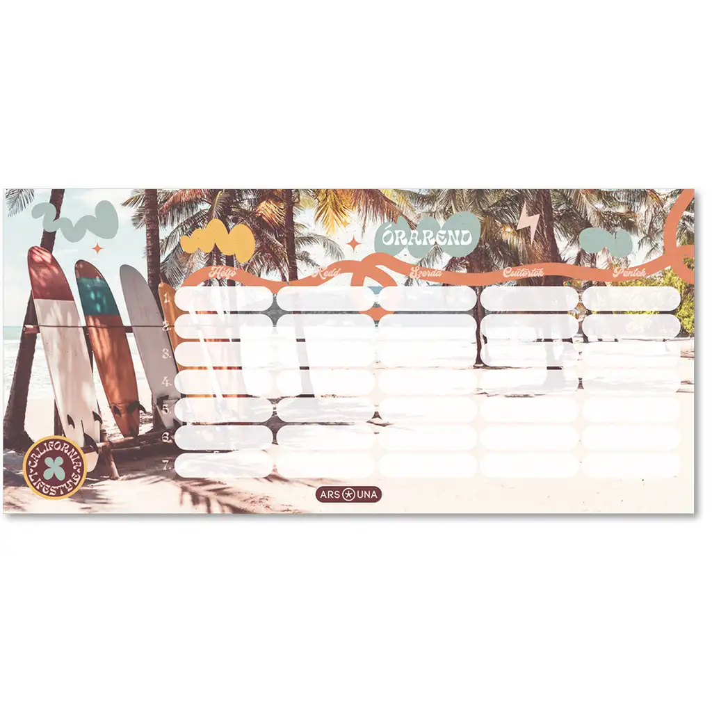Prenes letnú náladu do školských všedných dní s rozvrhom hodín California Lifestyle, ktorý evokuje svet slnečnej pláže, paliem a surfovacích dosiek! Tento praktický, jednostranný a obojstranný rozvrh hodín je ideálnou voľbou pre každého študenta, ktorý chce vniesť trochu štýlu a radosti medzi svoje školské pomôcky. Prehľadné usporiadanie umožňuje ľahkú orientáciu v rozvrhu, zatiaľ čo jedinečný dizajn ti každý deň vyčarí úsmev na tvári. Na jednej strane dominuje surferská, tropická atmosféra, zatiaľ čo na druhej strane sa rovnaká téma objavuje v inej farebnosti – takže si vždy môžeš vybrať, ktorá nálada ti práve vyhovuje.
