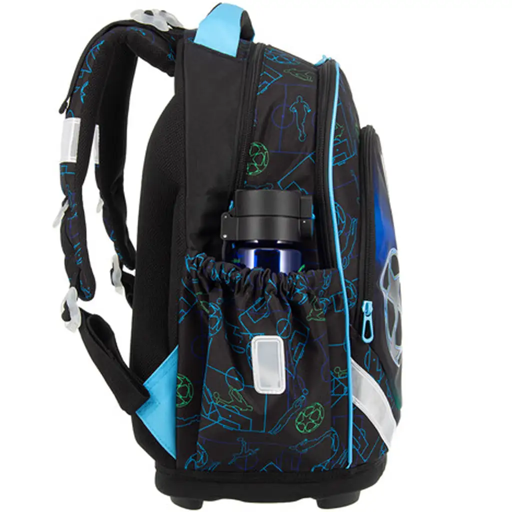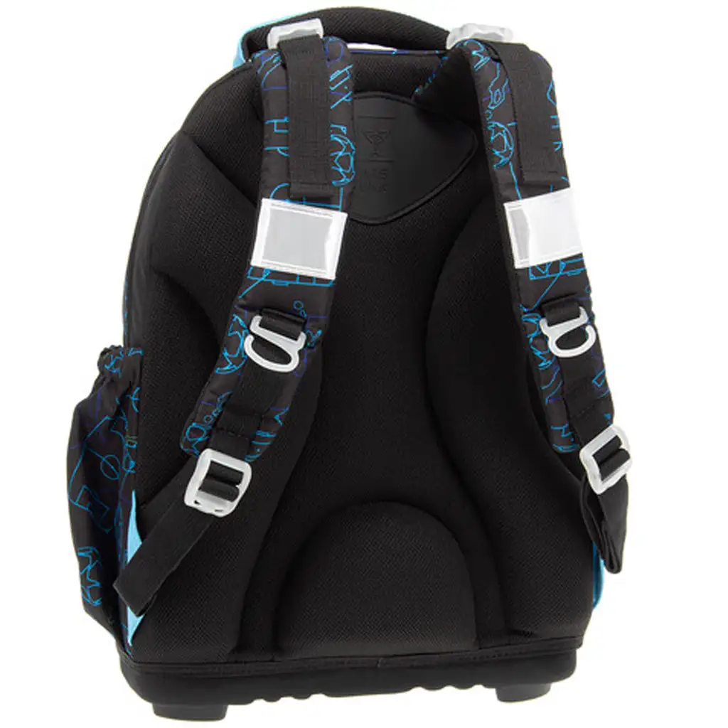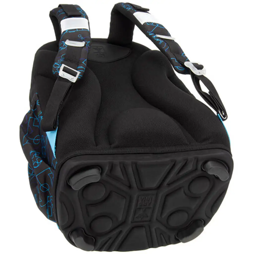 Spodná časť batohu je vyrobená z odolného, pevného materiálu a doplnená štyrmi stabilnými plastovými nôžkami – batoh je tak nielen trvácny, ale aj stabilne stojí na zemi. Vo vnútri sa nachádzajú tri priehradky na zips; najväčšia obsahuje textilnú prepážku pre lepšiu organizáciu, v najmenšej je prišitý držiak na písacie potreby a miesto na doklady. Dve bočné vrecká s elastickým okrajom poskytujú priestor na fľašu alebo ďalšie drobnosti. Na bezpečnosť sa tiež nezabudlo: batoh má niekoľko veľkých reflexných prvkov, aby bolo vaše dieťa dobre viditeľné aj v premávke.