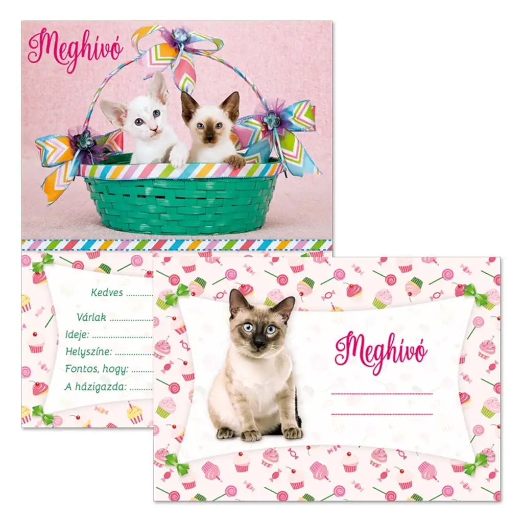 Toto 10-kusové balenie pozvánok na oslavu je perfektnou voľbou pre každého malého milovníka mačičiek, ktorý chce svojich kamarátov pozvať na narodeninovú párty alebo inú akciu hravým a roztomilým štýlom. Na prednej strane pozvánky sa z usmiateho zeleného košíka pozerajú milé mačiatka, ktoré sú ozdobené farebnými mašličkami a veselým cukríkovým pozadím – zaručene vyčaria úsmev na tvári každému pozvanému!