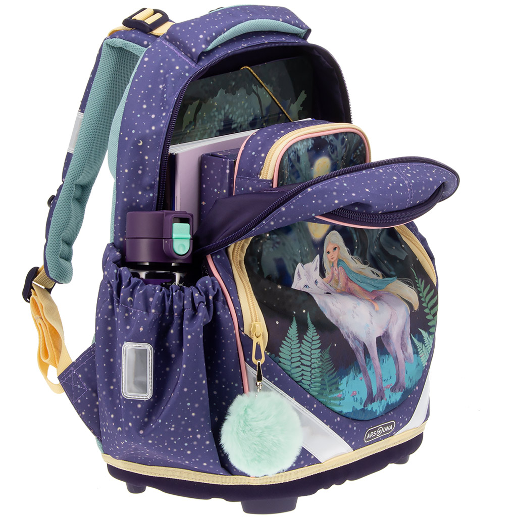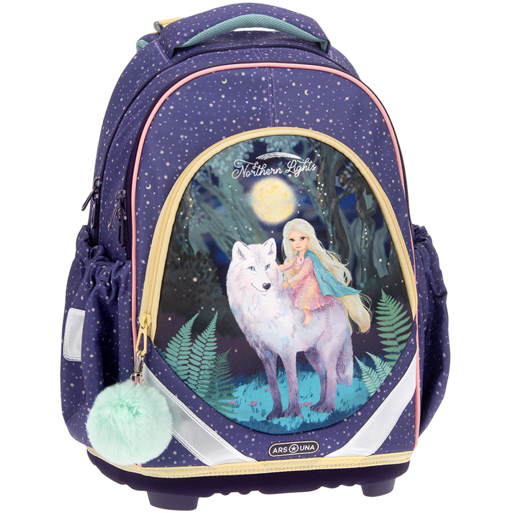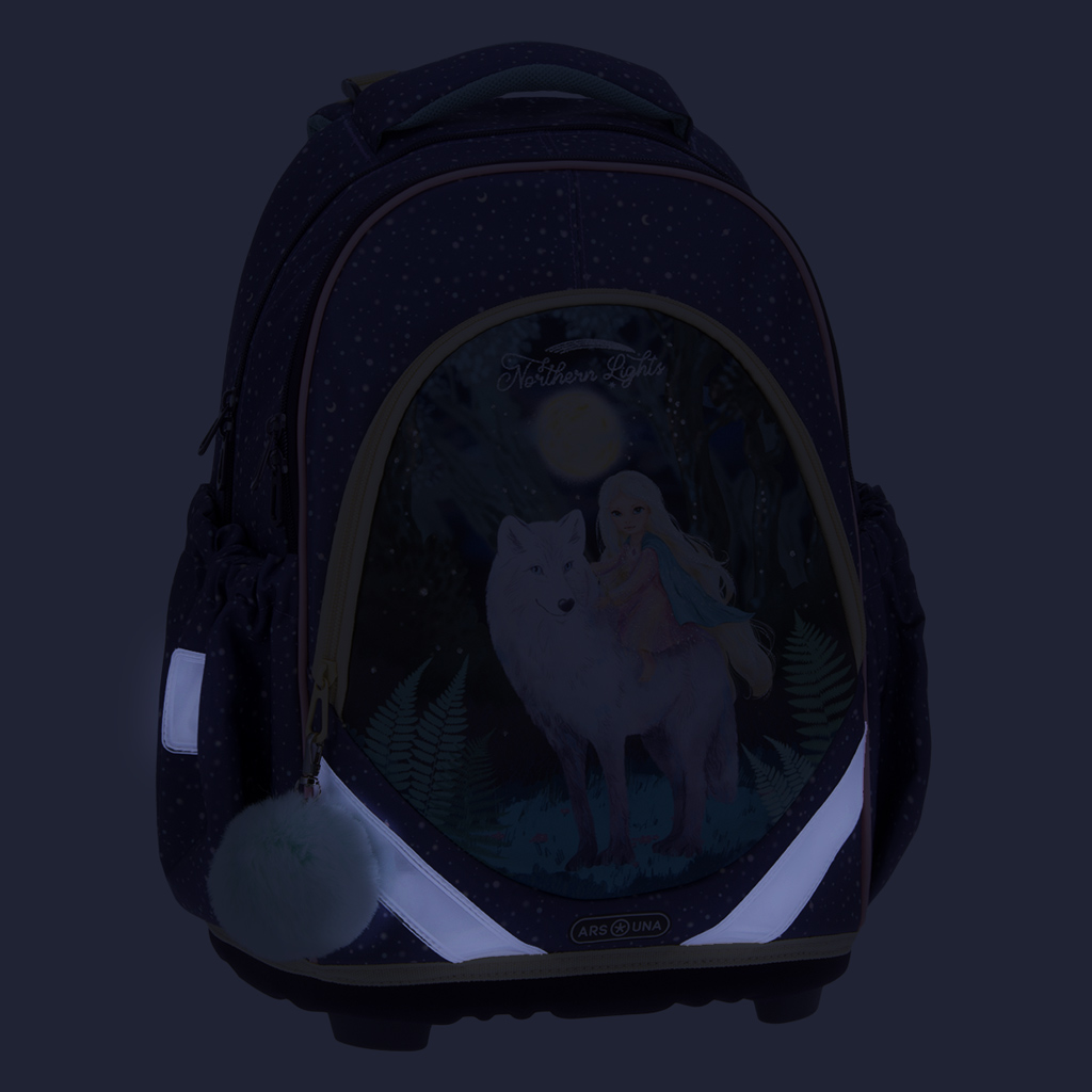 Anatomický školský batoh Ars Una Northern Lights je ideálnou voľbou, ak hľadáte ľahký, no pritom praktický a efektný batoh pre vaše dieťa na prvé roky základnej školy. Je určený špeciálne pre žiakov 1.–3. triedy, preto je jeho konštrukcia maximálne prispôsobená potrebám menších detí. Špeciálny, rozprávkový motív – dievčatko stojace v mesačnom svetle a biely vlk – poskytuje naozaj jedinečný vzhľad, ktorý deti budú milovať.