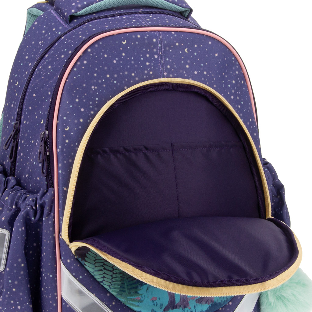 Praktické vnútorné usporiadanie pomáha pri organizovaní: má tri veľké vrecká na zips, z ktorých najväčšie obsahuje textilnú priehradku na knihy a zošity. V najmenšom vrecku sa nachádza samostatný držiak na písacie potreby a doklady, takže všetky drobnosti sa dajú uložiť upratané. Dve bočné gumové vrecká sú ideálne na fľašu alebo menšie predmety.