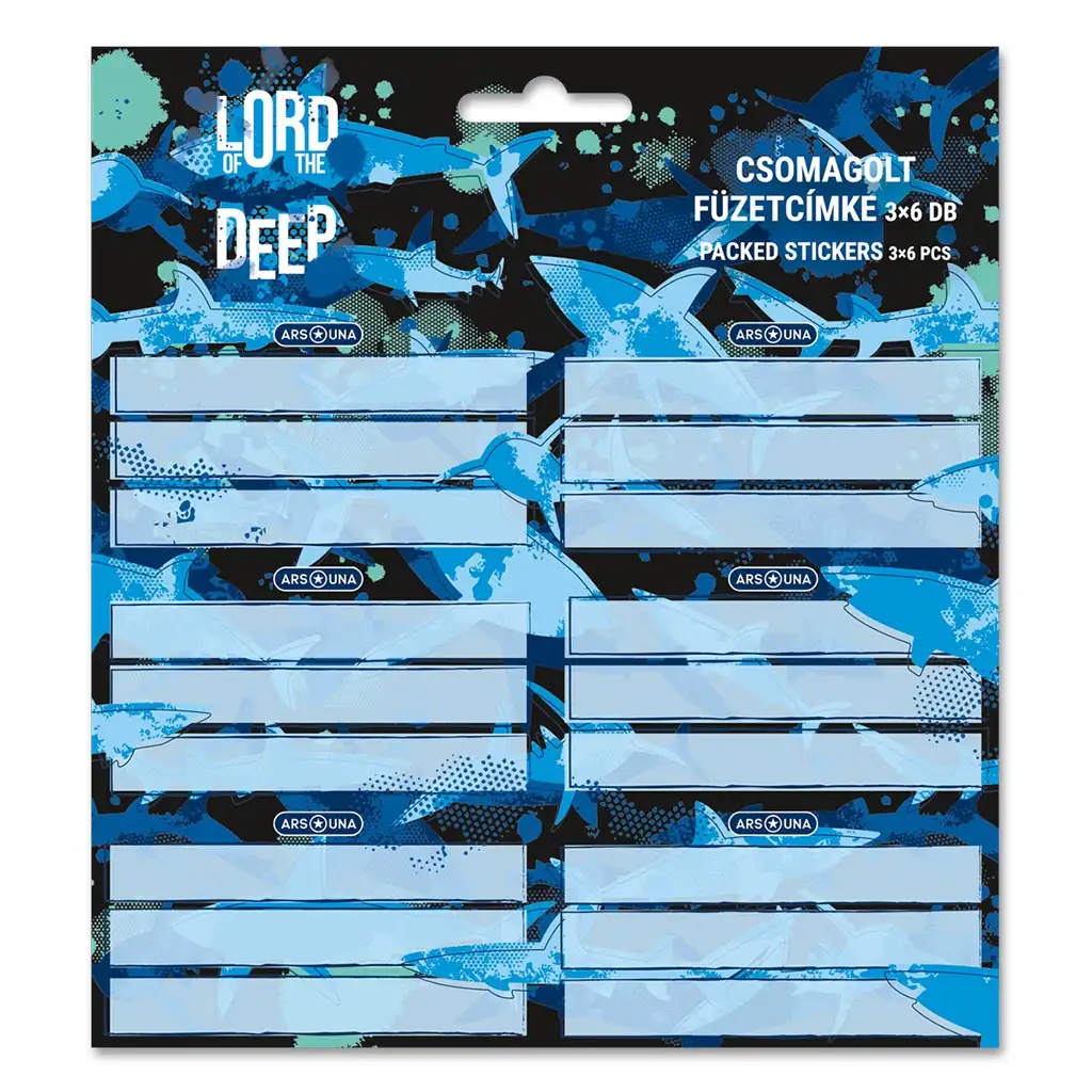 Sada štítkov na zošity Ars Una "Lord of the Deep" s motívom žralokov umožňuje fanúšikom hlbokomorských dobrodružstiev urobiť ich školské potreby jedinečnými. Výskyt žralokov plávajúcich pred modrým oceánskym pozadím prináša vzrušujúcu atmosféru do každodenného života. Balenie obsahuje 3 listy, na každom z nich je 6 štítkov so žralokmi, takže celkovo 18 štítkov umožňuje, aby boli zošity nielen rozpoznateľné, ale aj výrazné. Samolepiace štítky sa ľahko aplikujú a keď už nie sú potrebné, dajú sa bez zvyškov odstrániť. Ponorte sa do mora učenia s týmto ohromujúco špeciálnym setom štítkov na zošity!