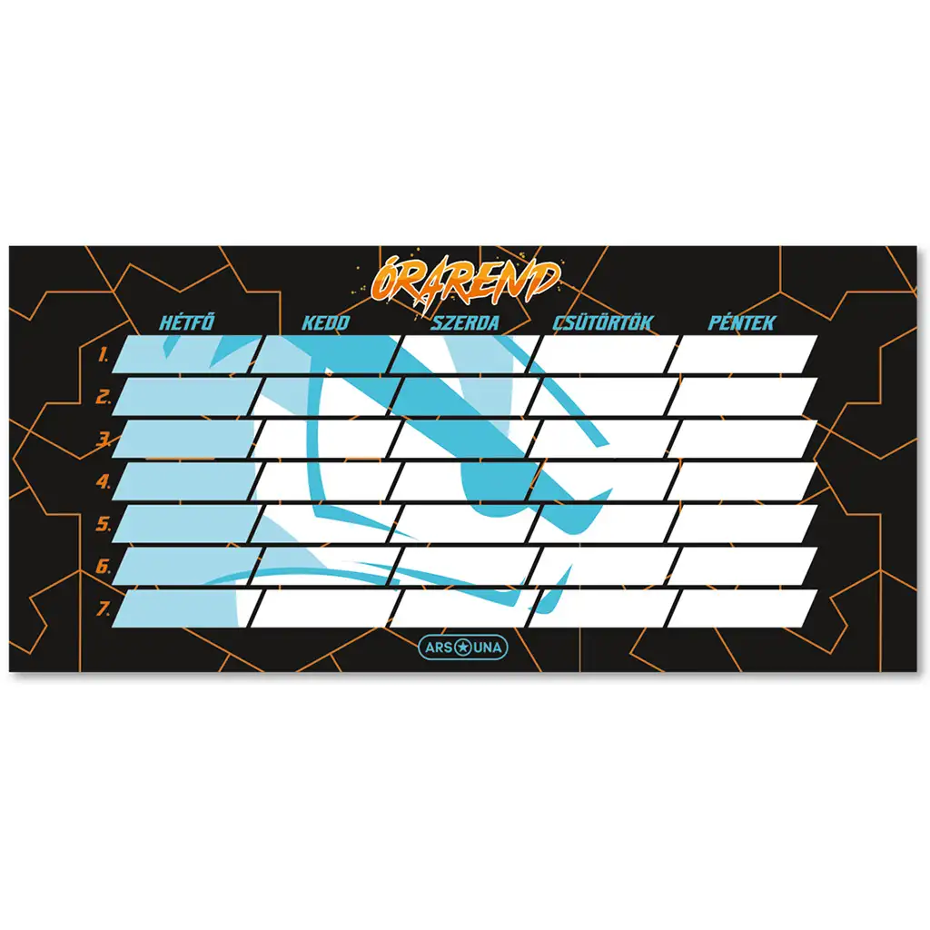 Zoznámte sa s rozvrhom hodín Ars Una Player One, ktorý je dynamickým a štýlovým doplnkom pre každého hráča-študenta. Tento rozvrh hodín je zdobený oranžovým pruhovaným vzorom na čiernom pozadí, takže je nielen praktický, ale aj cool a moderný, čo oživí každý váš deň.