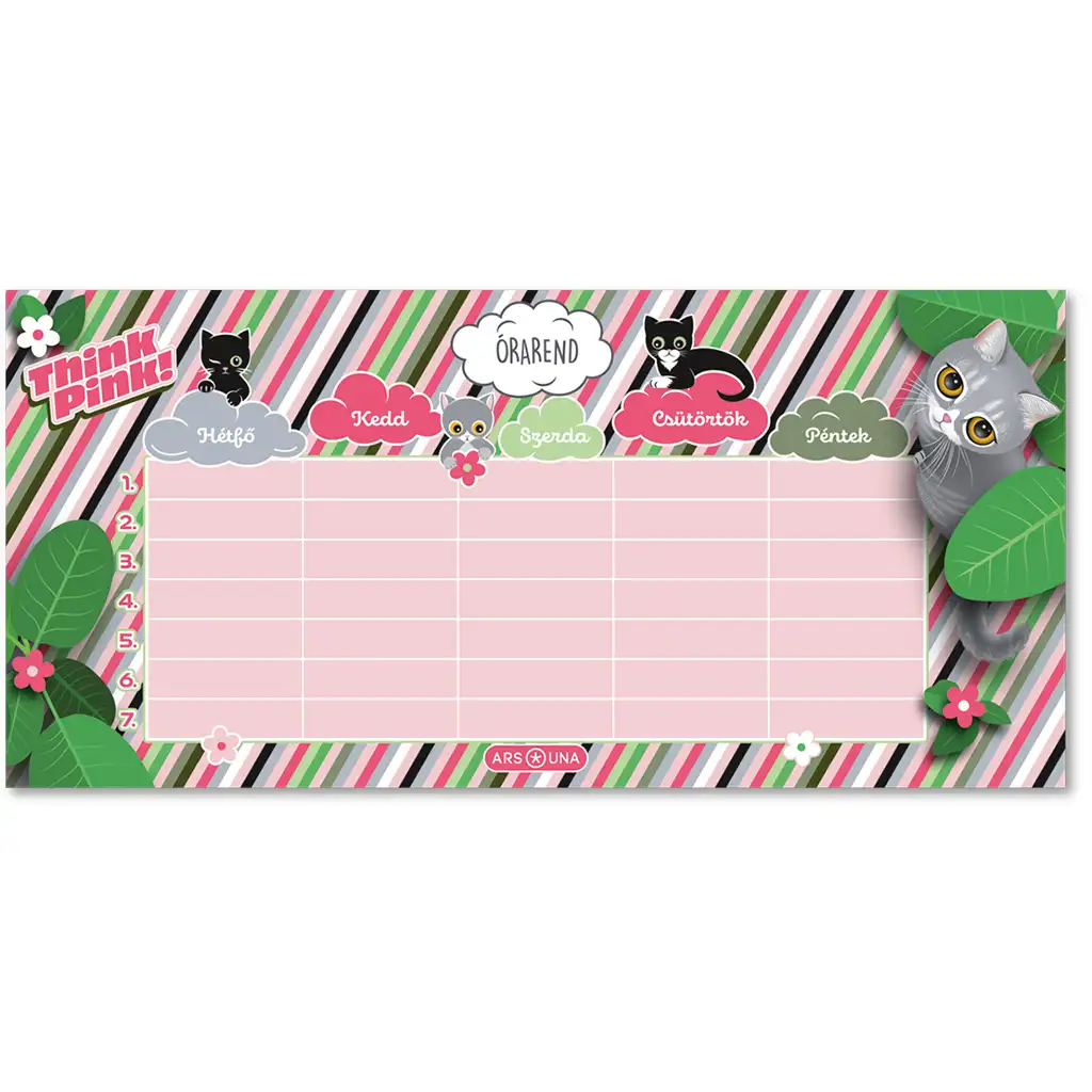 Dizajn Think Pink ponúka očarujúce mačacie postavičky, žiarivé farby a hravé tvary – všetko tak, aby bol týždenný rozvrh hodín prehľadný a ľahko vyplniteľný. Na ľavej strane sa nachádza očíslovaný stĺpec, ktorý pomáha organizovať vyučovacie hodiny, a vďaka obojstrannému prevedeniu je možné rozvrh využívať aj pre striedajúce sa týždne.