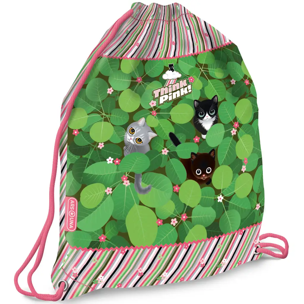 Športový vak Think Pink s mačkami sa stane obľúbencom každej malej milovníčky zvierat! Tri roztomilé mačičky vykúkajúce z veselého, zeleného listového sveta vykúzlia úsmev na každej detskej tvári, zatiaľ čo hravé farby – ružové pruhy a kvetinové ozdoby – robia jeho vzhľad ešte výnimočnejším. Tento športový vak nie je len rozkošný, ale aj mimoriadne praktický.