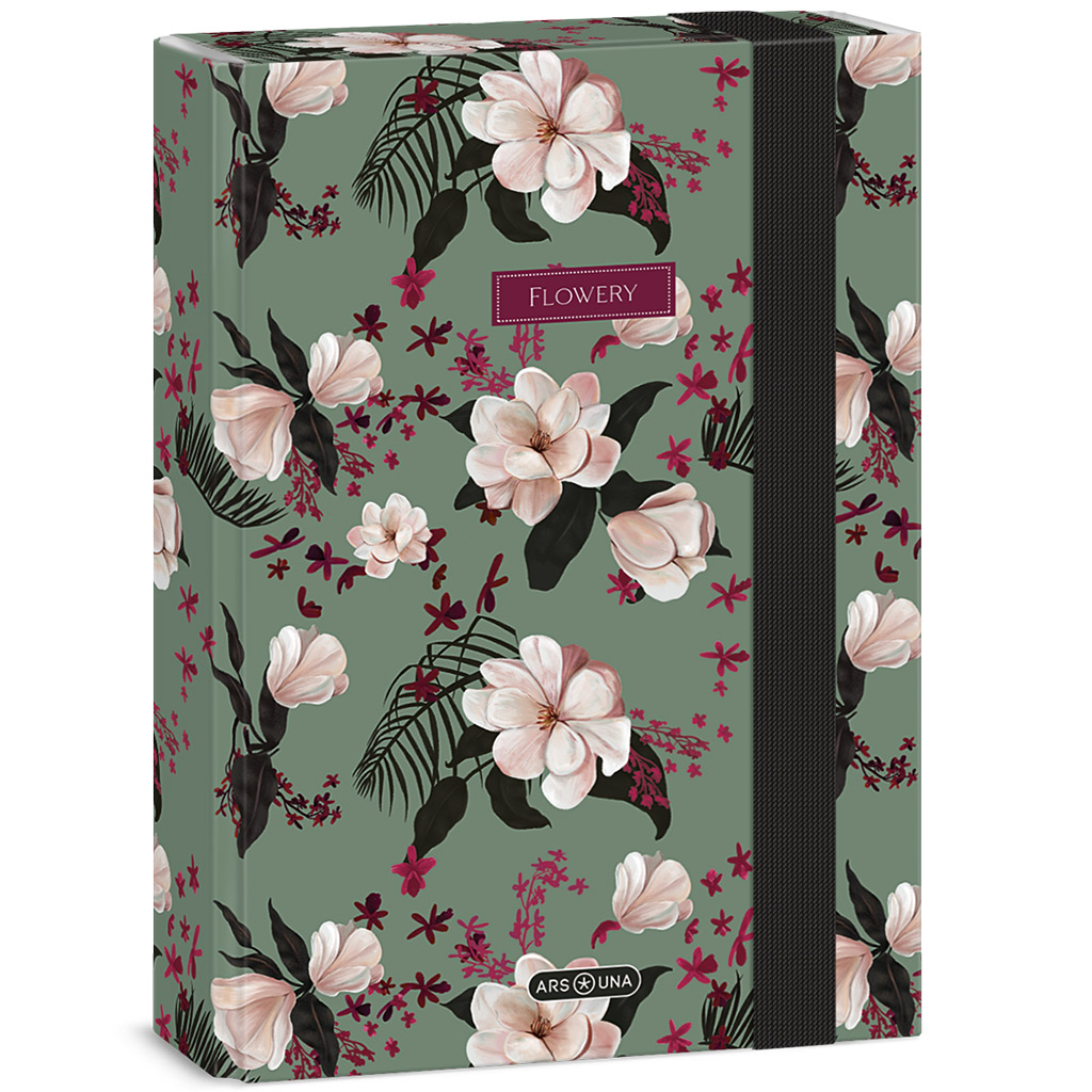 Ars Una: Flowery Green kvetinový box na zošity A5 vnáša do školských dní tvojho dieťaťa elegantnú a prírodnú atmosféru. Na zelenom podklade sa nachádzajúci jemne spracovaný kvetinový vzor zaručuje štýlový vzhľad a zároveň pôsobí príjemne a harmonicky. Masívne, pevné kartónové prevedenie účinne chráni zošity a dokumenty pred poškodením, takže zostanú vždy upratané. Zapínanie na gumičku zabezpečuje, že nič nevypadne. Praktická voľba do školy, na krúžky alebo na domáce usporiadanie.