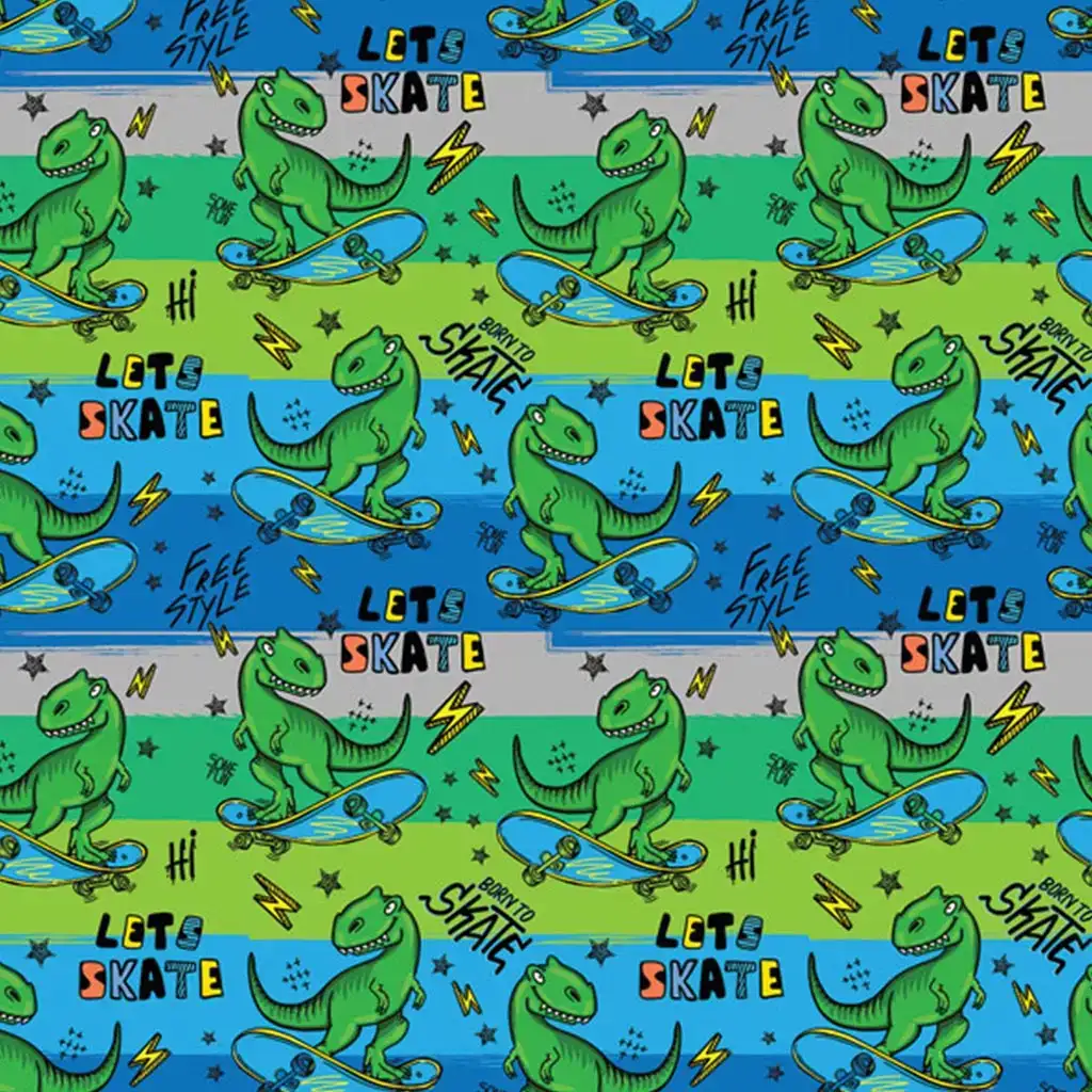 Vzor je naozaj moderný a hravý: štýlové figúrky T-Rexov sa preháňajú na modrých skateboardoch, pričom pruhované pozadie v zelených, modrých a sivých odtieňoch ešte viac podčiarkuje vzrušujúci dojem. Nápisy „Let’s Skate“ a „Freestyle“ zvýrazňujú streetový štýl, ktorý si zaručene získa každého mladého obdarovaného.
