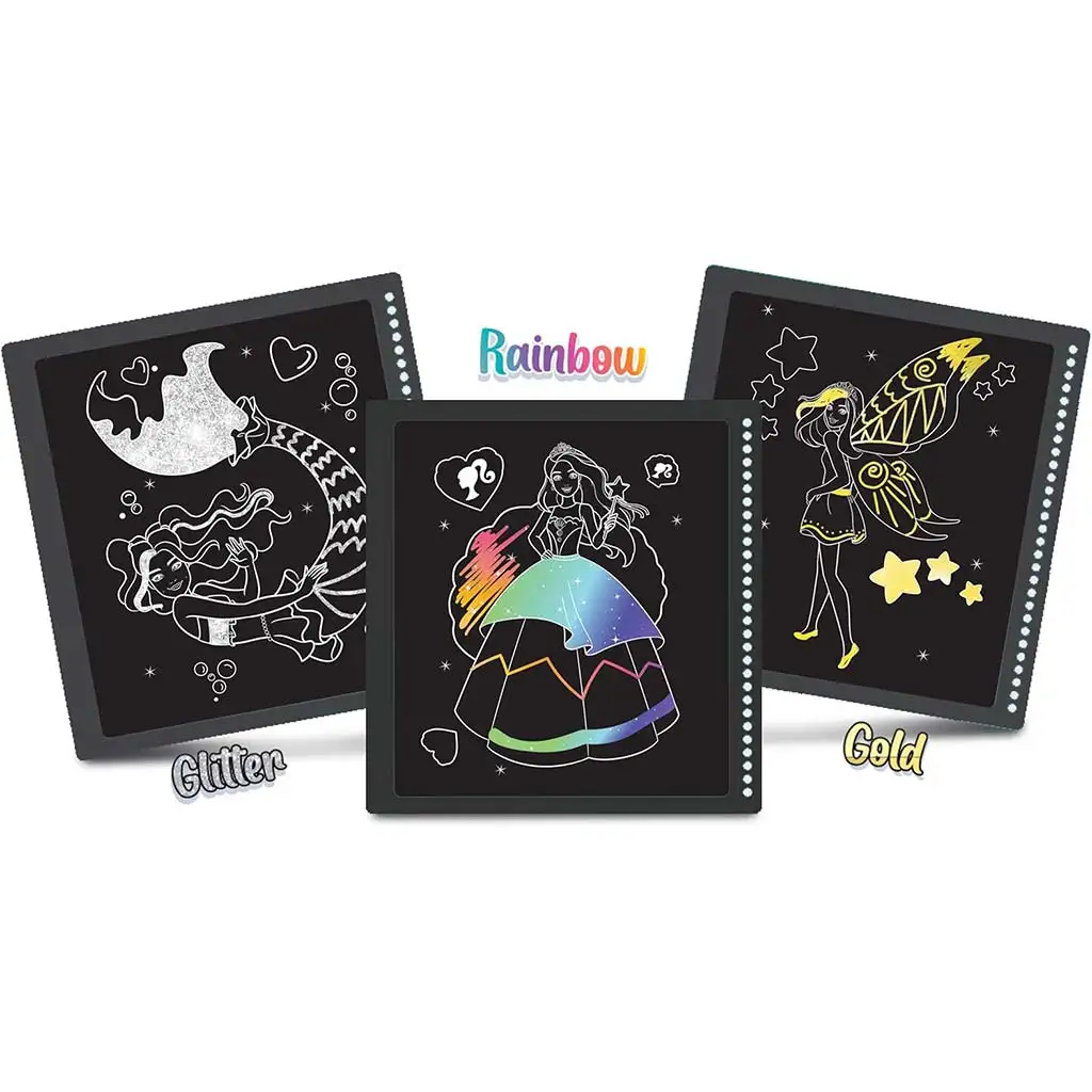Barbie Mer-Mazing sada na tvorbu škrabacích obrázkov je snom každého malého dieťaťa, ktoré miluje kreatívne tvorenie, trblietky a samozrejme Barbie! Tento 44-stranový zápisník so špirálovou väzbou je plný prekvapení s morskou tematikou, kde na deti čakajú morských panny, jednorožce, víly a princezné, aby ich pod rukami priviedli k životu. Čierne strany je potrebné zoškrabávať špeciálnym plastovým škrabacím nástrojom, takže s každým ťahom sa objavia magické farby – napríklad zlatá, trblietavá alebo dúhová.