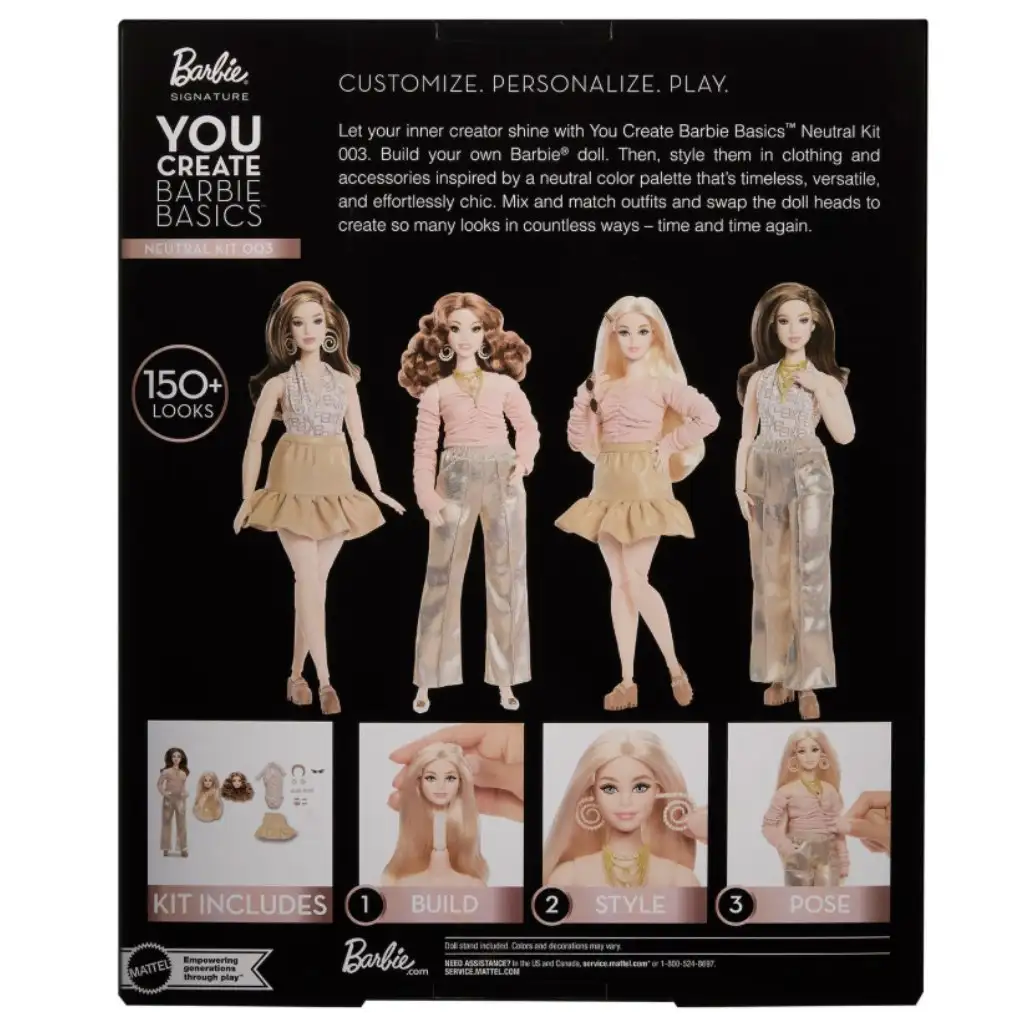 Barbie: You Create bábika je špeciálna, na kreativite založená herná sada, v ktorej si deti (a zberatelia) môžu opakovane vytvárať vlastný vzhľad Barbie. Táto prémiová sada je súčasťou kolekcie Barbie Signature a stavia do popredia možnosť personalizácie. Sada obsahuje viacero vymeniteľných prvkov, takže účes, oblečenie a štýl bábiky sú variabilné, čo umožňuje vytvoriť viac ako 150 rôznych vzhľadov. Oblečenie a doplnky v neutrálnych farbách pôsobia nadčasovo a elegantne, pričom podporujú sebavyjadrenie a experimentovanie s módou. Vďaka pohyblivým kĺbom je bábika jednoducho polohovateľná, čo robí hru a vystavovanie ešte zábavnejším. Je ideálnou voľbou pre tých, ktorí milujú jedinečný štýl, tvorenie a kreatívnu stránku sveta Barbie.