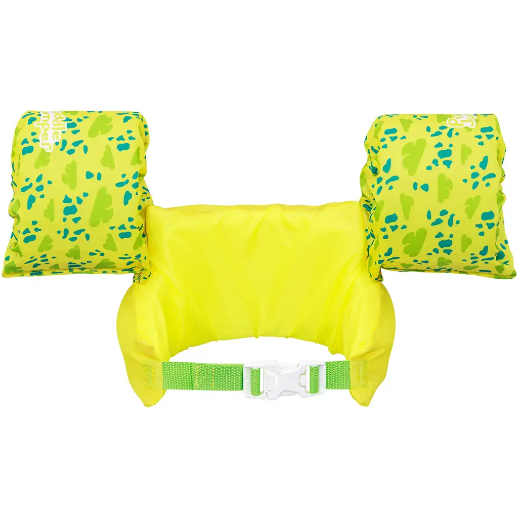 Táto plávacia vesta kombinuje výhody rukávnikov a hrudného popruhu, čím zabezpečuje stabilnejšiu oporu ako klasické rukávniky. Okrem plávacích vankúšikov na ruky je vesta vybavená aj polstrovanou časťou okolo tela, ktorá sa stará o správny vztlak, zatiaľ čo nastaviteľná pracka na chrbte umožňuje ľahké prispôsobenie veľkosti dieťaťa. Tento dizajn zabezpečuje, že vesta zostane pevne na mieste a nešmýka sa ani počas hry.