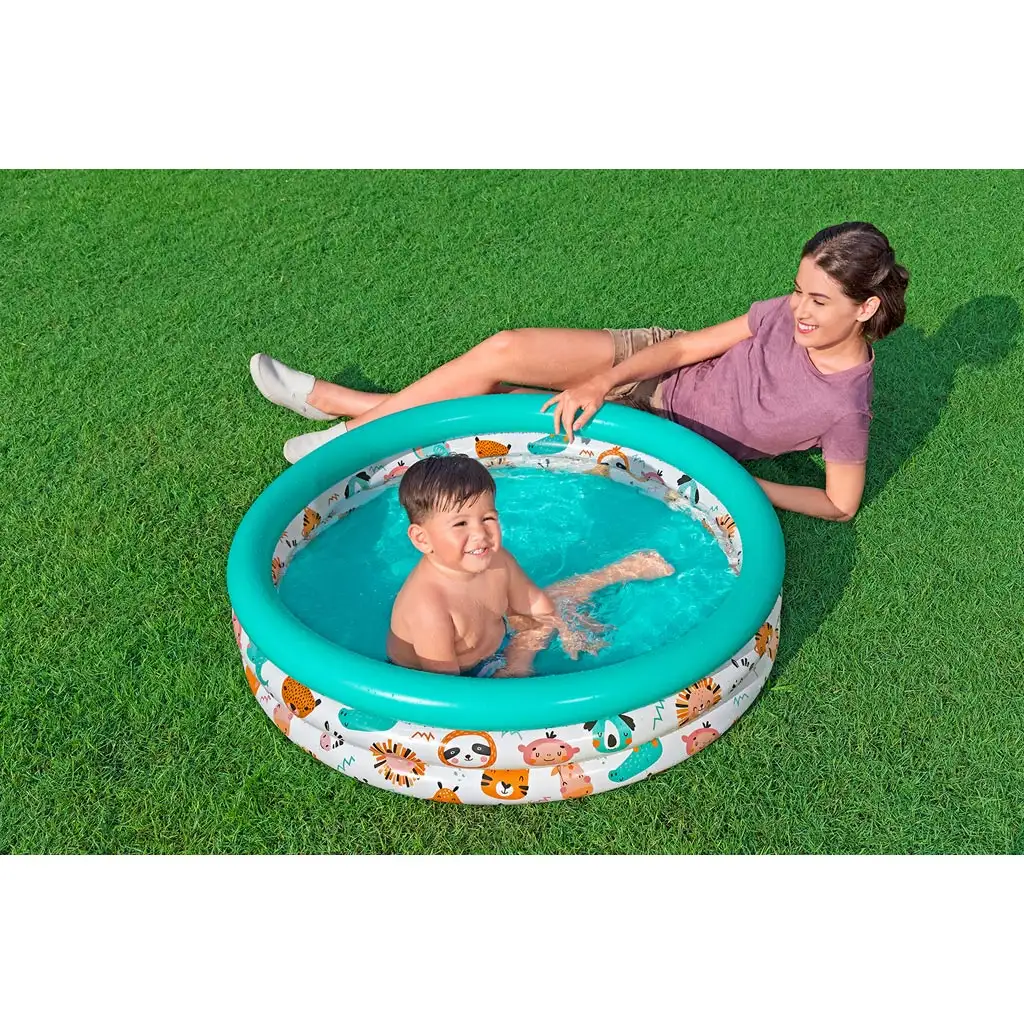 Bazén je zdobený farebným, zvieracím motívom, ktorý nie je len pútavý, ale aj podnecuje deti k hre. Lev, lenochod, žirafa, panda a ďalšie rozkošné postavičky sa na nich pozerajú zo stien bazéna, takže každé kúpanie je novým dobrodružstvom. Trojprstencová nafukovacia konštrukcia poskytuje mäkký, bezpečný a pohodlný okraj, o ktorý sa dá oprieť alebo si naň počas hry odpočinúť.