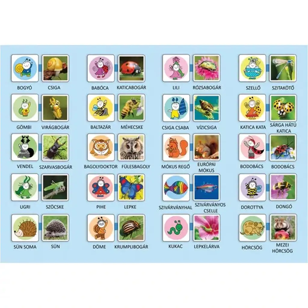 Rozvoj a zábava ruka v ruke – spoznajte svet Bogyó a Babóca s touto veselou pexesovou hrou! Kto je kto? pamäťová hra nie je len skvelá zábava pre najmenších, ale zároveň podporuje rozvoj pozorovacích schopností, koncentrácie a pamäti. Milé postavičky – Bogyó, Babóca, Baltazár, Pihe a ostatní – sa teraz spájajú so skutočnými zvieratami, takže počas hry prebieha aj učenie: ku komu patrí lienka, včielka, slimák alebo sova?