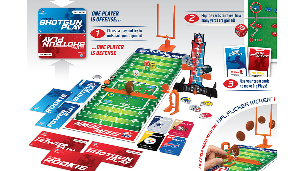 Ak ľudia vedia, ako sa hrá americký futbal, ľahko rozpoznajú, ako sa hra futbalu objavuje aj vo forme spoločenskej hry. Hru NFL Showdown sme zjednodušili na štyri základné pokusy a vysvetľujeme, čo znamená pojem „first down“ pre tých, ktorí toto pravidlo nepoznajú. Počas hry sa sústreďujeme na tieto hlavné pravidlá a snažíme sa vytvoriť herný priebeh tak, aby bol ľahko sledovateľný s minimálnym čítaním alebo dokonca bez čítania. Tým pádom bude hra zábavná a ľahko naučiteľná pre každého, bez ohľadu na to, ako dobre pozná pravidlá amerického futbalu.Chceli sme do toho vniesť aj nejaký zábavný a zároveň hravý prvok. Počas futbalu sa veľa hádže a chytá, preto sme tento zážitok chceli preniesť aj na hraciu dosku pomocou NFL Flicker Kicker. Táto novinka prináša do hry úplne iný druh zručnosti a akčného prvku, čím ju robí ešte vzrušujúcejšou a rozmanitejšou. Hráči tak nielen premýšľajú, ale môžu sa aj aktívne zapojiť do hry, čo prináša ešte viac radosti a smiechu pre všetkých.Herný priebeh NFL Showdown je vzrušujúci a dynamický, kde hráči robia strategické rozhodnutia, aby porazili svojich súperov. Počas hry každý riadi americký futbalový tím a používa rôzne karty pri útokoch a obrane. Hráči musia dávať pozor na schopnosti hráčov, taktiku a správne načasovanie.