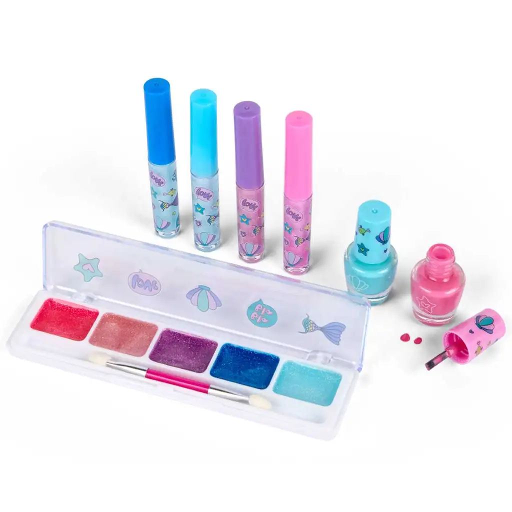 Balenie obsahuje trblietavú paletu očných tieňov so šiestimi rôznymi odtieňmi (červená, ružová, fialová, modrá a svetlomodrá), dva laky na nechty (veselá modrá a ružová farba) a štyri lesky na pery, ktoré žiaria v pastelových farbách. Všetky produkty sú vhodné pre deti, ľahko sa zmývajú, takže líčenie je nielen zábavné, ale aj úplne bezpečné.