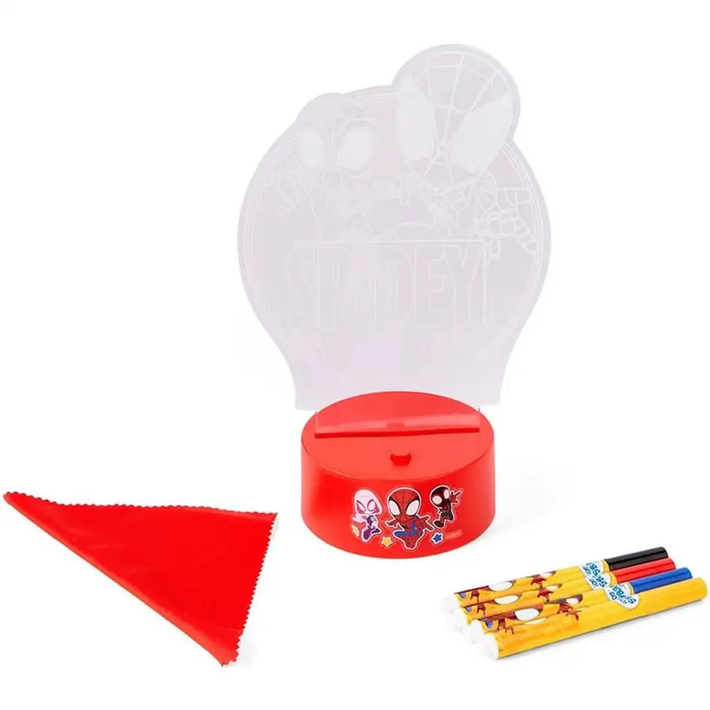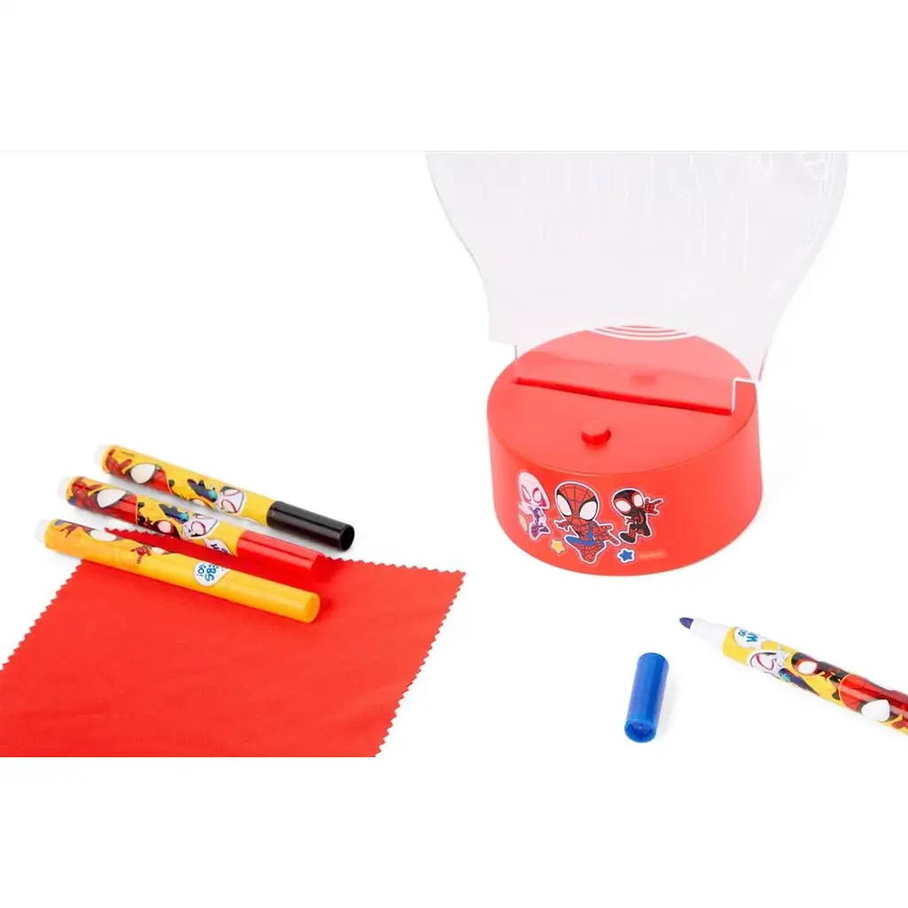 Súprava obsahuje LED podstavec, priehľadnú, svetielkujúcu platňu s motívom Spidey a jeho priateľov a 4 živé farebné fixky, ktorými si deti môžu obrázok vyfarbiť podľa vlastnej fantázie. Keď je majstrovské dielo hotové, LED osvetlenie privedie kresby k životu, takže nejde len o zábavné tvorenie, ale aj o praktický a upokojujúci nočný zdroj svetla. Lampa má tri úrovne jasu, takže ju môžete jednoducho prispôsobiť nálade izby a zvyklostiam pri zaspávaní.