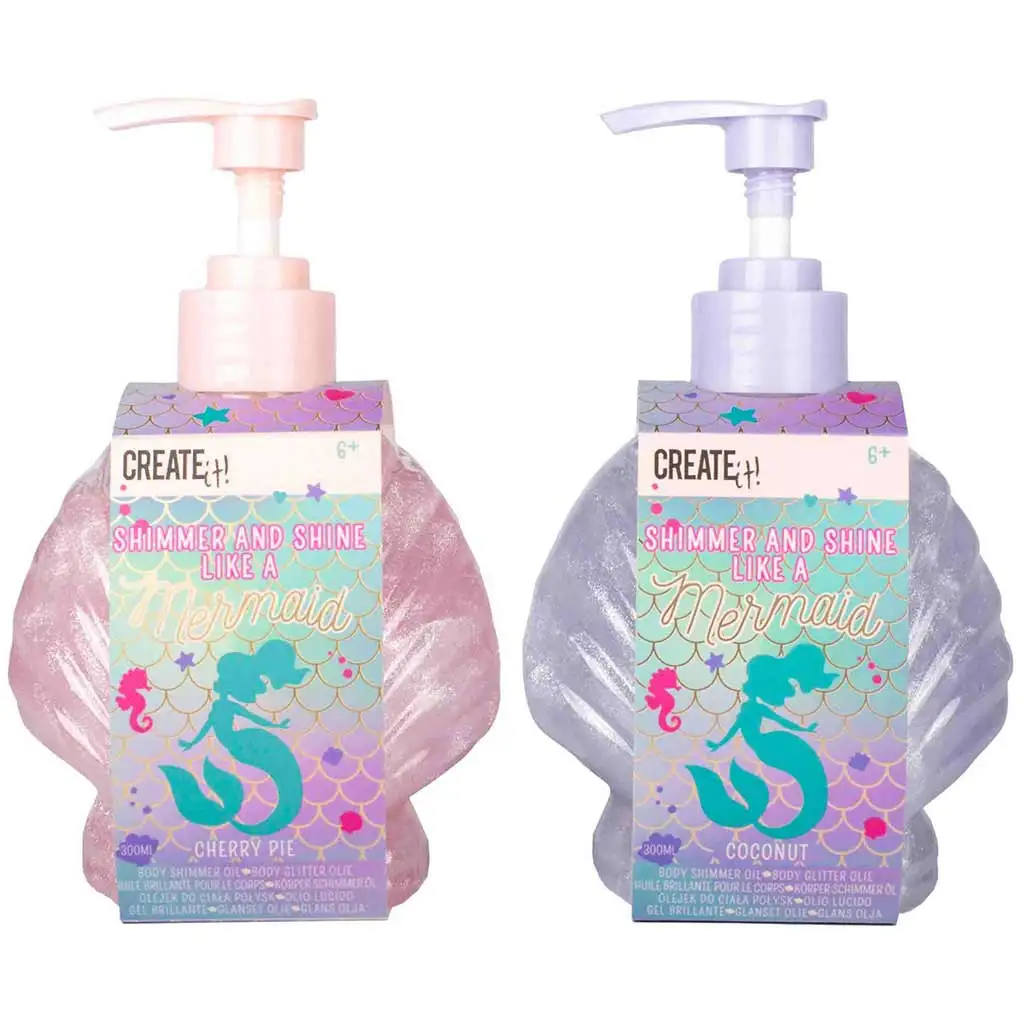 Pridaj do každodenného života čarovný lesk morských víl s "Create It! Lesklý telový gél morskej víly" od Canenco v dvoch variantoch! Tento špeciálny telový gél prichádza v lesklom, tvarovanom flakóne morskej víly s pumpičkou, aby si mohol ľahko dávkovať nádherný lesk pre tvoju pokožku. Oba varianty, ružový s vôňou čerešňového koláča a fialový s vôňou kokosu, majú zvláčňujúci účinok a dodávajú pokožke lesk, zatiaľ čo jej poskytujú pravý lesk morskej víly. Obe varianty sú dostupné v balení 300 ml a sú odporúčané od 6 rokov. Buď každý deň výnimočný, nechaj svoju pokožku žiariť ako hviezda!