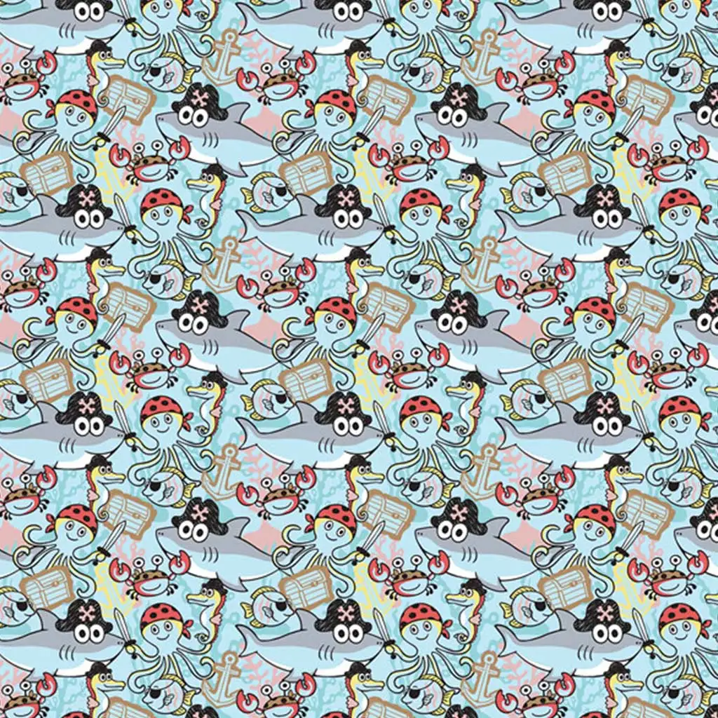 Prekvapte najmenších balením, ktoré navodzuje atmosféru skutočného morského dobrodružstva! Balení papier Pirátske Morské Dobrodružstvo vo veľkosti 100x70 cm je perfektnou voľbou na balenie detských darčekov, pretože každý jeho štvorcový centimeter je plný vzrušujúcich detailov: usmievavé chobotnice s mečom a pirátskou čiapkou, žraloky s páskou cez oko, malé kraby, kotvy, morské hady, truhlice s pokladom a množstvo ďalších veselých morských postavičiek tancuje na svetlomodrom pozadí.