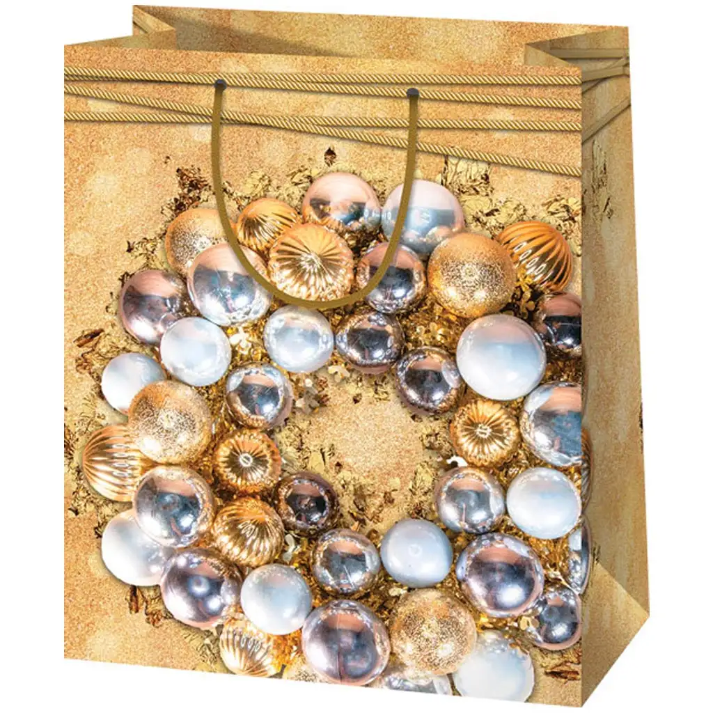 Táto zlatá darčeková taška Cardex je stelesnením vianočnej elegancie. Dizajn tašky zdobí veniec zložený z trblietavých zlatých, strieborných a perleťových vianočných gúľ, ktorý vyžaruje skutočnú luxusnú atmosféru. Priestranná veľkosť 26x13x33 cm je ideálna pre väčšie darčeky, ako sú oblečenie, knihy alebo dokonca menšie dekoratívne predmety. Zlaté pozadie a jemné detaily dodávajú taške sviatočný lesk, takže už sama o sebe poskytuje pôsobivý vzhľad vášmu darčeku. Materiál z odolného papiera a zlaté rukoväte poskytujú silné a spoľahlivé držanie, aby váš darček bezpečne dorazil do cieľa. Perfektná voľba pre tých, ktorí hľadajú skutočne štýlové balenie na sviatky.