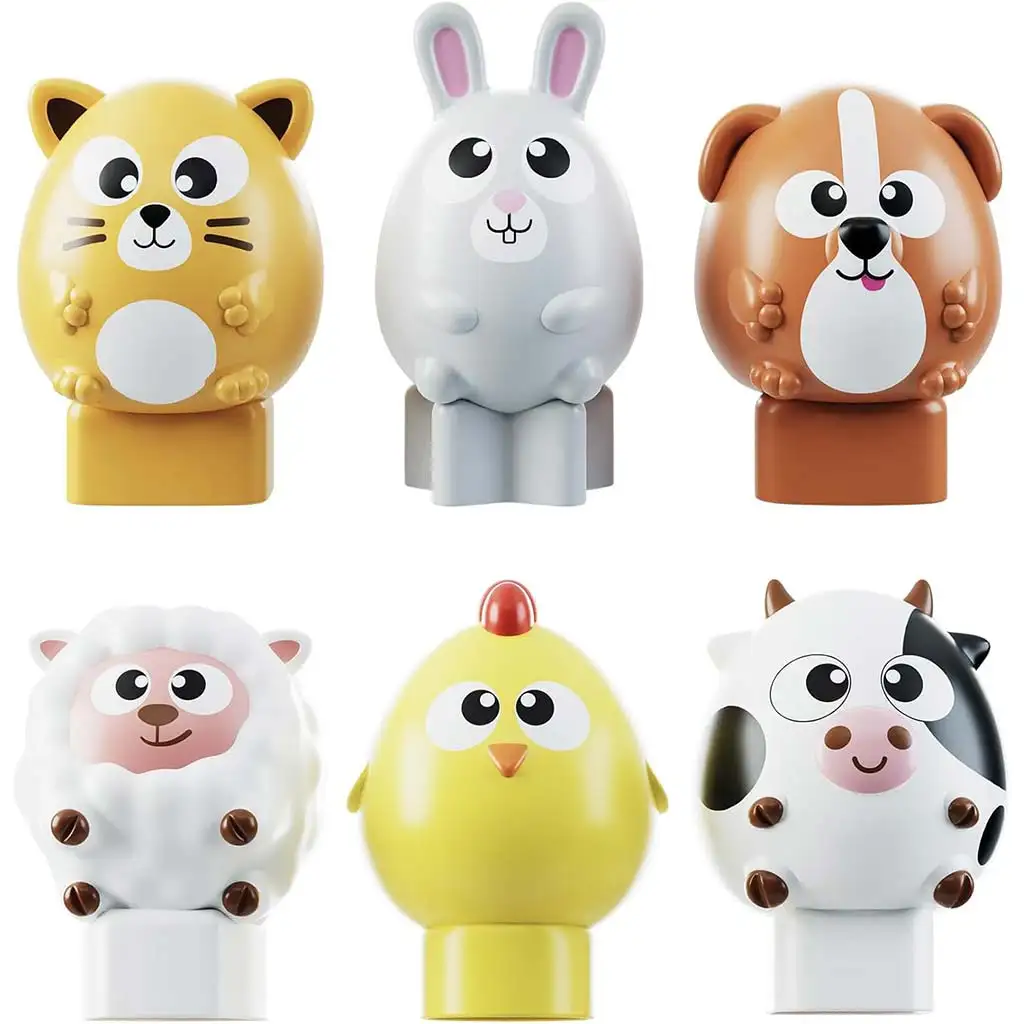 V hre treba šesť rôznych farmárskych zvierat – mačka, zajačik, psík, ovečka, kuriatko a kravička – správne vsadiť do príslušných otvorov na zelenej podložke. Každá figúrka má jedinečný tvar a roztomilú tváričku, takže deti ich ľahko spoznajú a rozlíšia. Veľkosť zvieratiek je prispôsobená malým detským rukám, vďaka čomu ich môžu bezpečne uchopiť a jednoducho vložiť na správne miesto.