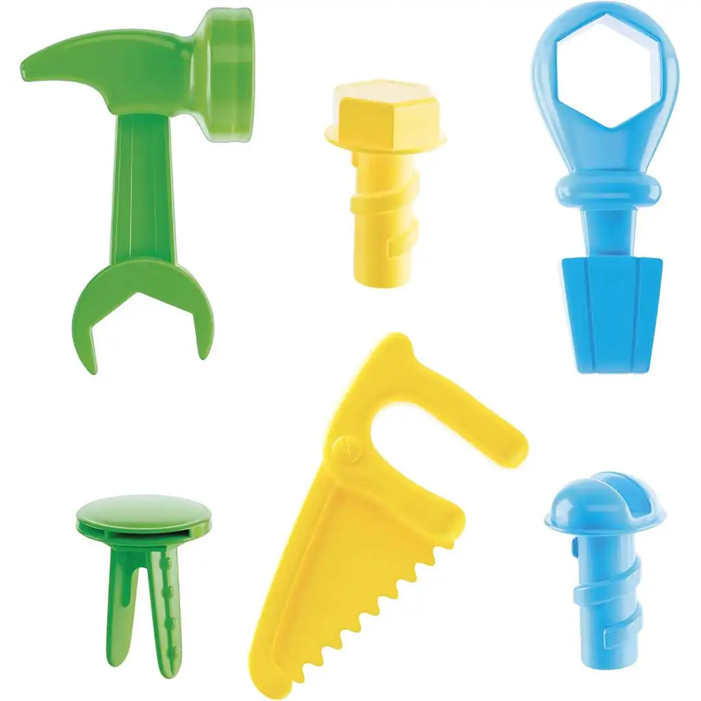 Súprava obsahuje šesť rôznych farebných tvarov – napríklad skrutkovač, kladivo, vidlicový kľúč alebo pílu – ktoré pomáhajú dieťaťu rozpoznať základné tvary a nástroje, pričom hravou formou rozvíja koordináciu oko-ruka aj schopnosť riešiť problémy. Tvary fungujú na princípe samokorekcie, teda dajú sa zasunúť iba na správne miesto, takže dieťa má vždy pocit úspechu.