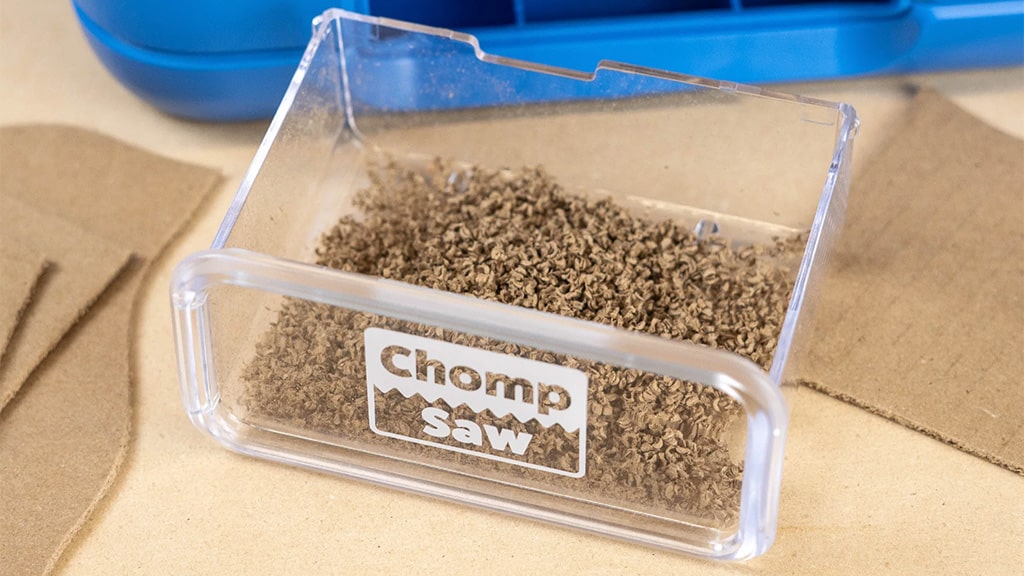 ChompSaw bol navrhnutý predovšetkým na rezanie kartónu, ale výborne sa dá použiť aj na materiály ako textil, papier alebo hobby penová hmota. Pri navrhovaní ChompSaw sa kládol dôraz na bezpečnosť — neprestrihne vlasy, prsty ani oblečenie. Napriek tomu, pre ešte bezpečnejšie a pohodlnejšie tvorenie, odporúča sa deťom zviazať dlhé vlasy a vyhnúť sa voľnému, širokému oblečeniu. Pre najlepší výkon sa odporúča opatrovateľom každých 30 minút vyprázdniť zásuvku na kartónové piliny, aby sa predišlo upchatiu. ChompSaw je tak nielen bezpečný, ale aj praktický a ľahko použiteľný nástroj na všetky kreatívne činnosti, či už ide o domáce majstrovanie alebo školské projekty.Malí stavitelia; rozvoj jemnej motoriky; kreatívne deti; nadšenci pre ručné práce; hraj sa a ukáž svoje výtvory