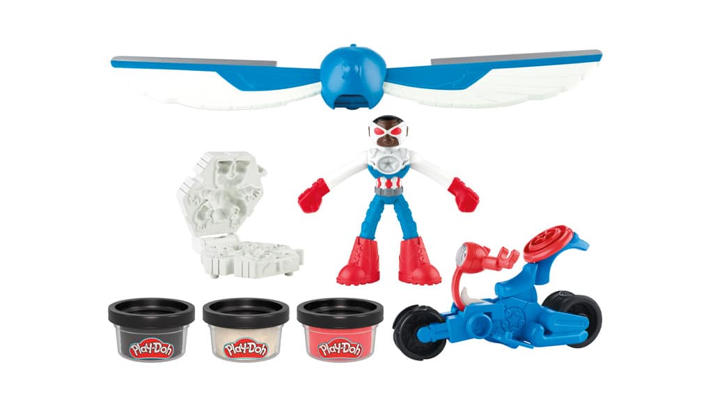 Táto súprava obsahuje niekoľko foriem a štyri mini balenia modelovacej hmoty Play-Doh, ktoré sú dostupné v zelených, čiernych, bielych, ako aj v červeno-modrých zmiešaných farbách. Deti môžu pomocou priložených foriem vytvoriť Play-Doh plášť pre figúrku Darth Vadera, vytvoriť opasok pre Lukea Skywalkera, vytvarovať Play-Doh "svetelný meč" a dokonca si vytvoriť vlastného mäkkého R2D2. Táto kreatívna hra poskytuje deťom príležitosť ponoriť sa do sveta Star Wars, zatiaľ čo rozvíjajú svoju zručnosť a predstavivosť. Kombináciou rôznych farieb a tvarov sa pred nimi otvárajú nekonečné možnosti na vytváranie nových dobrodružstiev v galaxii.Táto súprava obsahuje figúrku Sama Wilsona ako flexibilného Kapitána Ameriky. Deti môžu figúrku pripevniť k motorke (jeho ruky sa dokonca pripoja k riadidlám), motorku môžu posúvať cez farebnú Play-Doh, aby vytvorili hviezdy, a môžu s ňou aj rezať! Deti môžu tiež použiť formy na vytvorenie zloduchov alebo pripojiť 2 v 1 krídla ku Kapitánovi Amerikovi.