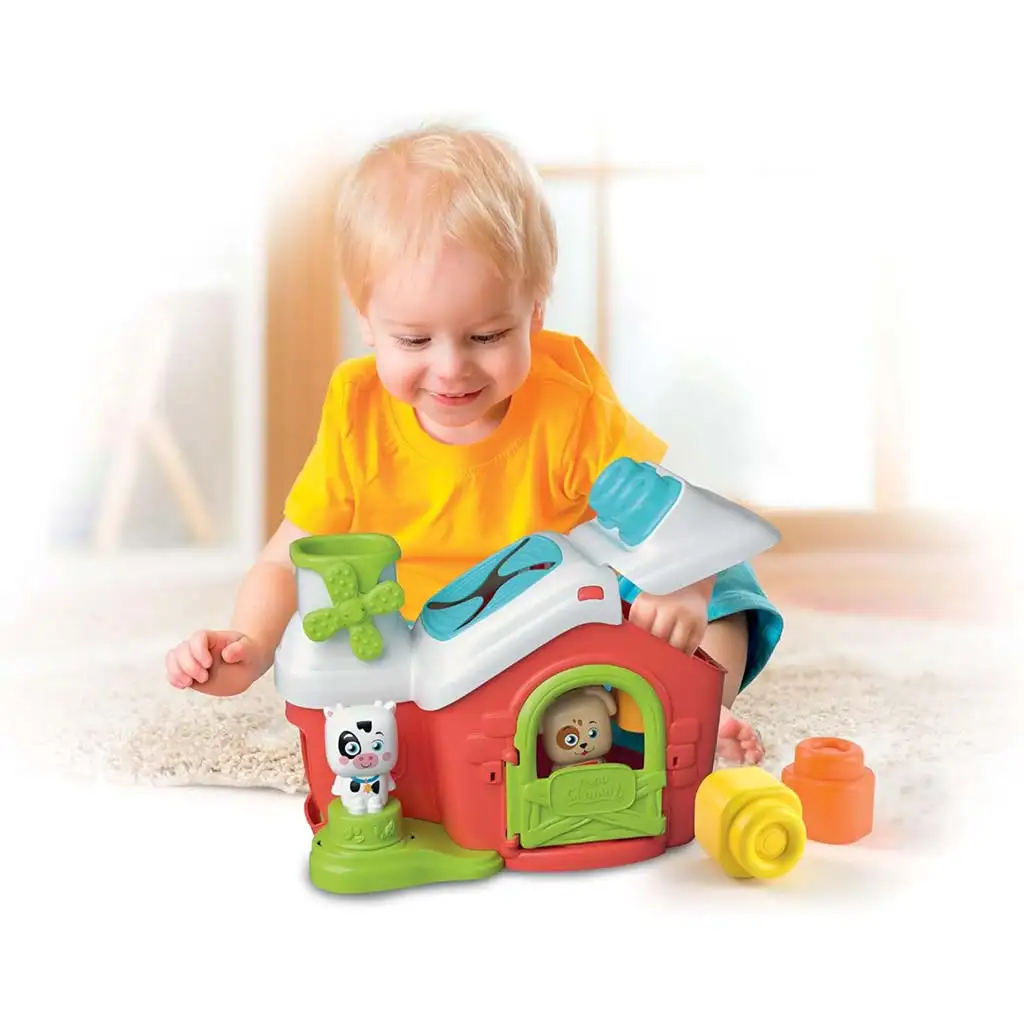 Clemmy Sensorická mäkká farma je ideálna prvá stavebnica pre najmenších! Táto farebná, mäkká na dotyk farma rozvíja zmysly bábätiek a zároveň poskytuje bezstarostnú zábavu. Sada obsahuje 8 mäkkých Clemmy stavebných kociek a 2 roztomilé figúrky zvieratiek, ktoré pomáhajú deťom spoznávať tvary, farby a príčinné súvislosti. Farma má rôzne interaktívne prvky: otočný veterný mlyn, otváracie dvere a zabudovanú šmykľavku, po ktorej môžu mäkké kocky skĺznuť. Živé farby a rôzne textúry stimulujú zrak a hmat, zatiaľ čo zvieratká pomáhajú pri hre na role a rozvoji predstavivosti. Hračka je určená pre deti vo veku 6-36 mesiacov, je bezpečná, umývateľná, a tak zaručuje mäkký a bezúrazový zážitok z hry!