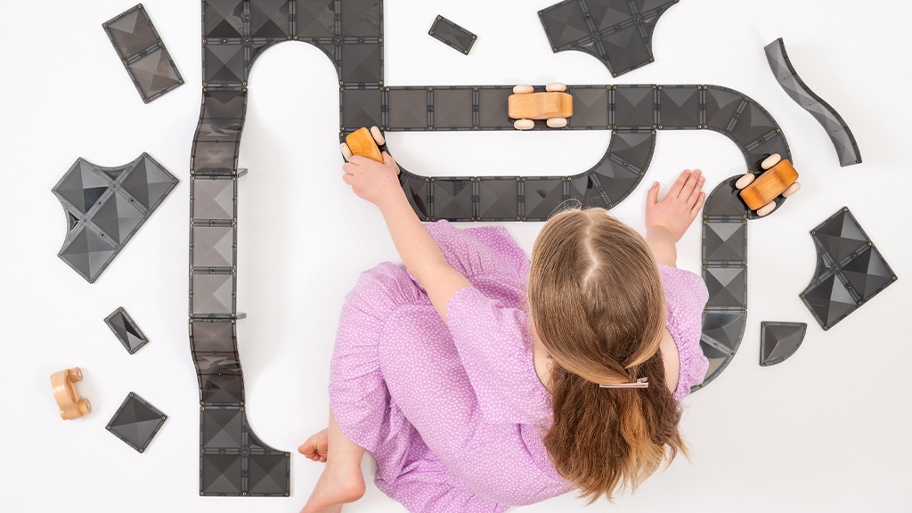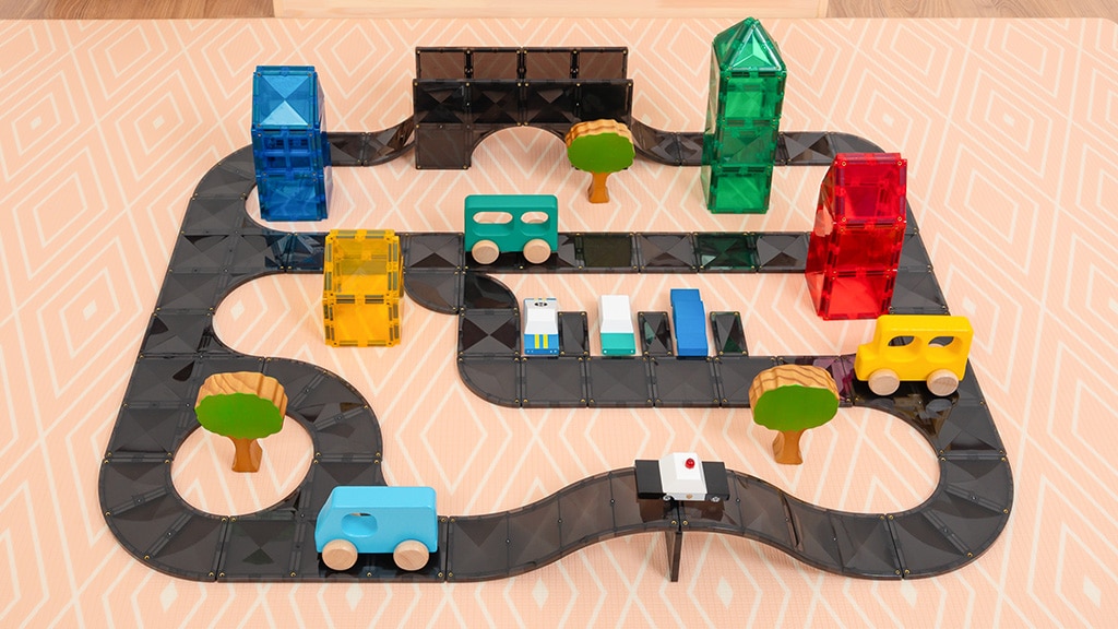 Tento set predstavuje elegantné čierne dlaždice a nové tvary dlaždíc v kolekcii Connetix. Inšpirované skutočnými cestami, tieto nové magnetické dlaždice dávajú detskej predstavivosti miesto vodiča, zatiaľ čo vytvárajú jedinečné cesty pre akékoľvek hračkárske auto. Okrem tradičných štvorcových dlaždíc set obsahuje oblúky, križovatky, štvrťkruhy, dlhé rampy a krátke rampy. Deti môžu použiť všetkých 48 dielov na navrhovanie vlastných jedinečných letísk, skateboardových parkov, miest a oveľa viac.