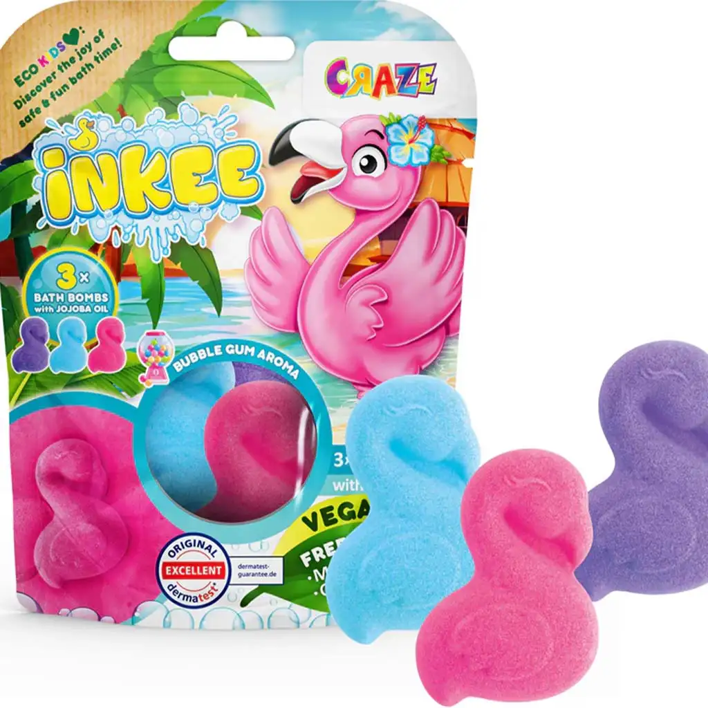 Urobte z kúpeľa zážitok s Inkee bombami do kúpeľa v tvare plameniaka s vôňou žuvačky, ktoré deti očaria nielen svojou vôňou, ale aj farbami! Balenie obsahuje tri farebné bomby do kúpeľa v tvare plameniaka, ktoré po vhodení do vody šumivo uvoľňujú veselé bublinky a charakteristickú sladkú vôňu žuvačky. Obsahujúci jojobový olej zanecháva detskú pokožku jemnú a hydratovanú, takže zážitok je nielen zábavný, ale aj ošetrujúci.