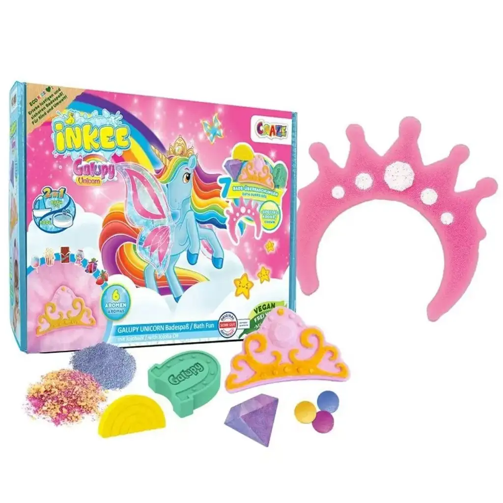 Urobte kúpanie naozaj magickým s veľkou kúpeľovou bombou Craze Inkee Galupy Unicorn, ktorá je snom každého malého fanúšika jednorožcov! Táto úžasná, farebná sada neponúka len jednoduchý kúpeľový zážitok, ale skutočné dobrodružstvo plné vôní, prekvapení a kreatívnej zábavy.