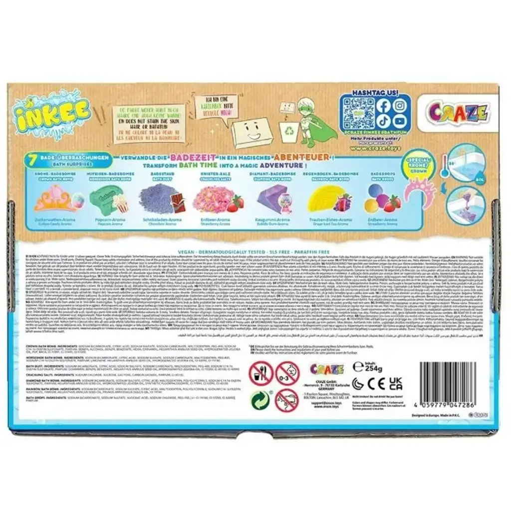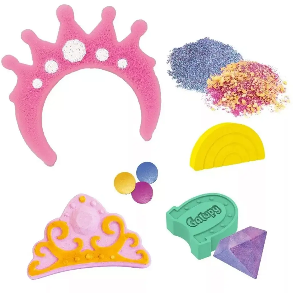 V balení nájdete 7 rôznych kúpeľových prekvapení, vrátane kúpeľovej bomby s vôňou cukríkov, praskajúcej kúpeľovej soli s jahodovou arómou, ovocných kúpeľových perál, dúhového kúpeľového plátu a mnoho ďalších! Každý kus so svojím jedinečným tvarom, farbou a vôňou premení večerné kúpanie na skutočný zážitok. Špeciálnym doplnkom sady je zlatá koruna, s ktorou sa deti môžu cítiť ako skutočné kúpeľové princezné alebo princovia!