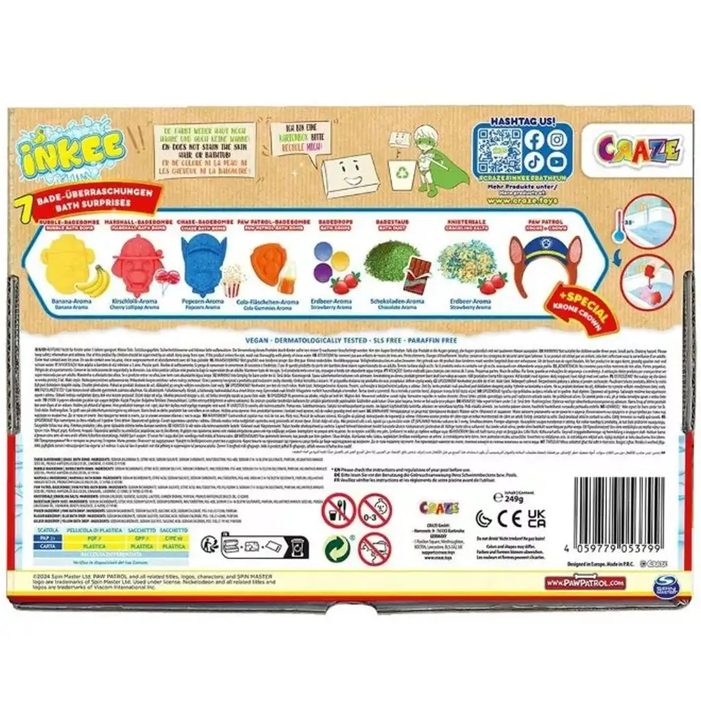 Začína sa záchrana kúpeľa s Tlapkovou patrolou! Craze Inkee Tlapková patrola veľká kúpeľová sada je vzrušujúci, 7-dielny kúpeľový prekvapivý balíček, ktorý zaručene oživí kúpanie vo vani pre každé dieťa. Hlavnými hrdinami balíčka sú Chase, Marshall a Rubble, ktorí pomáhajú deťom spríjemniť a prevoňať večerné kúpanie vo forme voňavých kúpeľových bômb.