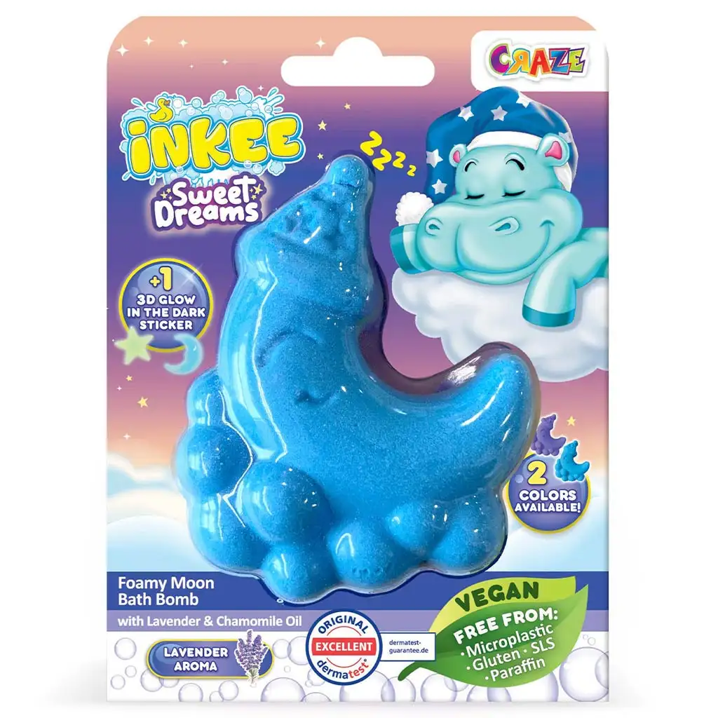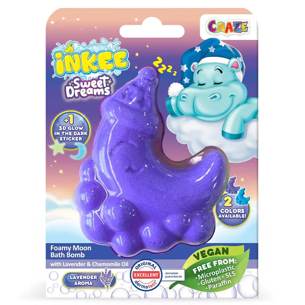 Urobte večerné kúpanie detí upokojujúcim a magickým s Craze Inkee Sladký sen penovou bombou v tvare mesiaca! Táto špeciálna bomba v tvare mesiaca s jemnou vôňou levandule a harmančeka pomáha deťom uvoľniť sa a pripraviť sa na pokojnú noc. Bomba sa šumivo rozpúšťa vo vode, pričom vytvára bohatú penu a napĺňa kúpeľovú vodu nádhernými farbami – žiariacimi v modrej alebo fialovej.