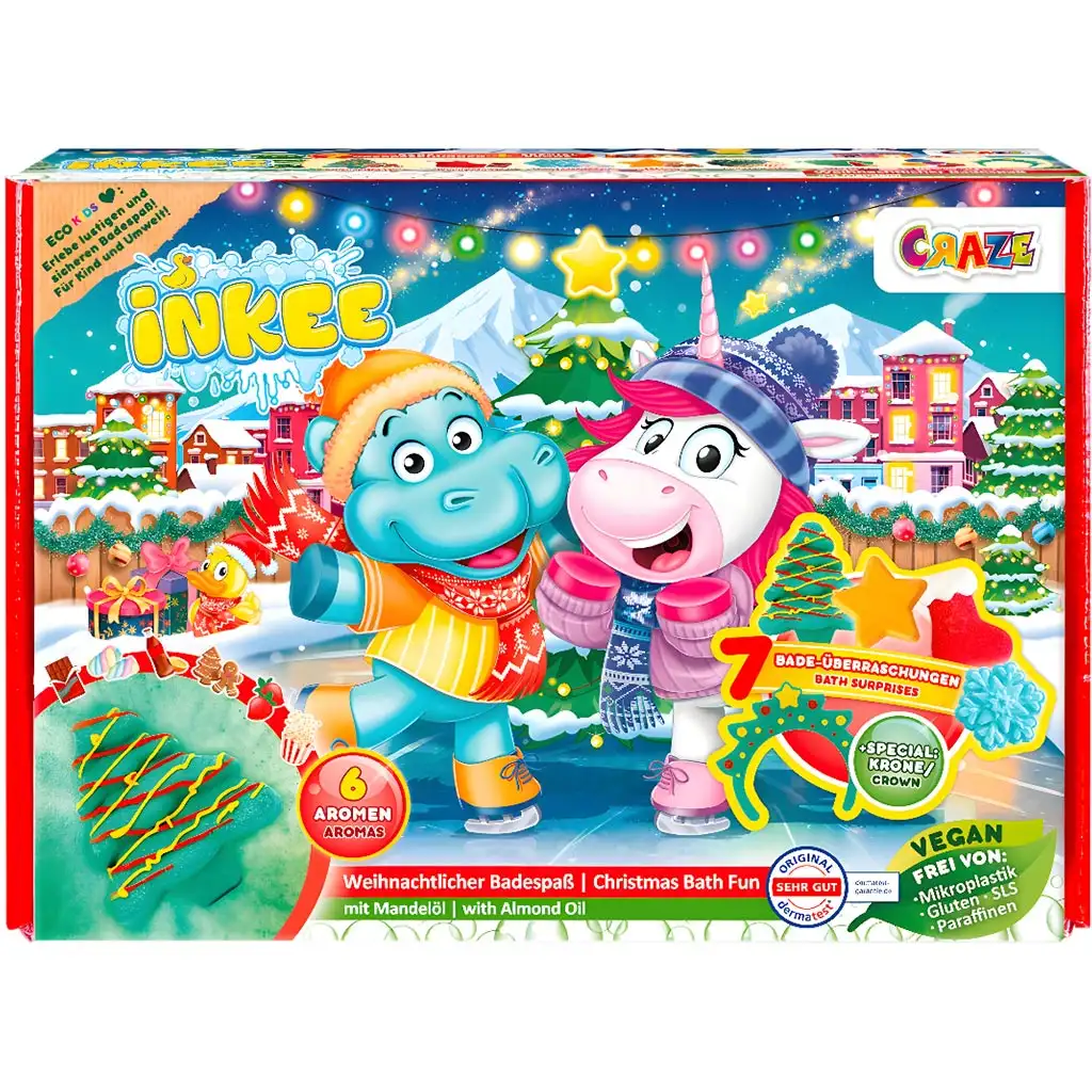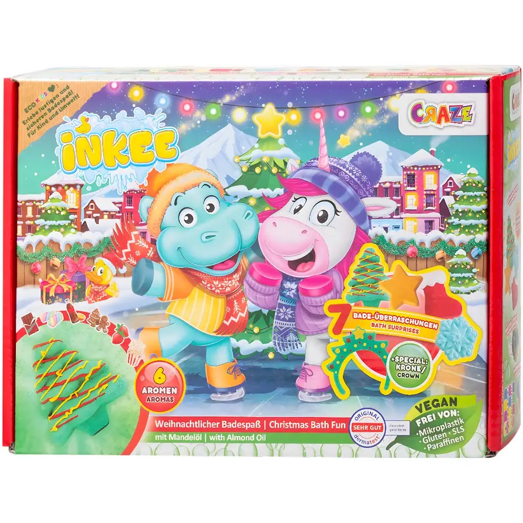 Urobte z kúpania magický zážitok so súpravou vianočných kúpeľových hračiek Inkee, ktorá premení každé kúpanie na skutočný sviatočný zážitok! Vianočné vydanie obľúbenej série Inkee od spoločnosti Craze ukrýva 7 rôznych prekvapení, takže pri každom kúpeli čaká na deti v kadi nová radosť. Hlavnými postavičkami v súprave sú veselý hrošík a jeho jednorožec kamarát, ktorí sa už tešia, že sa spolu ponoríte do farebných, voňavých a šumivých vôd.