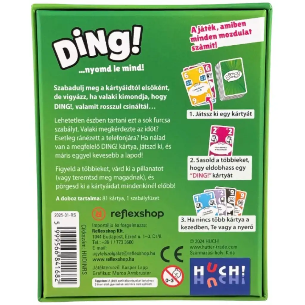 Ding! je bleskurýchla kartová hra založená na reflexoch a pozorovacích schopnostiach, kde sa za jednoduchými pravidlami skrýva nečakaný chaos. Na prvý pohľad sa balíček zdá byť založený na ľahkej mechanike „farba na farbu, číslo na číslo“, no skutočná podstata hry spočíva v drobných pohyboch okolo vás. Niekto sa poškrabe na nose? Pozrie sa na telefón? Opýta sa, koľko je hodín? Ak máš správnu DING! kartu, môžeš okamžite reagovať a zbaviť sa ďalšej karty. Cieľ je jednoduchý: zbav sa všetkých kariet ako prvý — ale musíš byť neustále v strehu, pretože každý pohyb sa počíta.