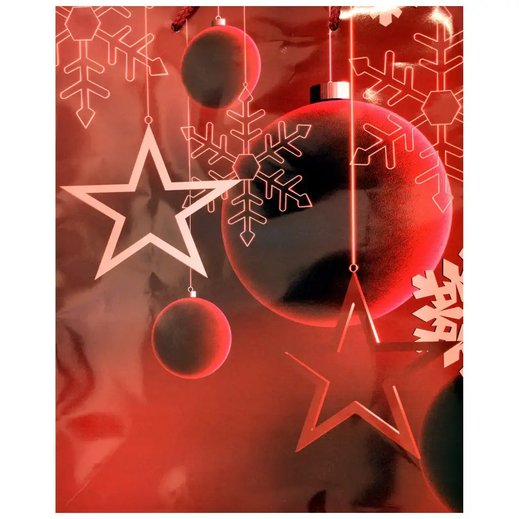 Pozri sa na túto nádhernú darčekovú tašku! Červená farba sama osebe pripomína sviatky, navyše vzor vianočných ozdôb, ako sú snehové vločky a gule, ju robí naozaj sviatočnou. Rozmer 26x32x12,5 cm je akurát taký, aby sa do nej zmestili vybrané prekvapenia, a lesklý povrch na taške dodáva darčekovaniu ešte iskrivejší moment. Posilnené dno a odolné uši zabezpečujú, že všetko bude v bezpečí, keď sa dostane pod stromček. Táto taška nie je len pekná, ale aj praktická, ideálna voľba, aby si darčekovanie urobil ešte špeciálnejším.