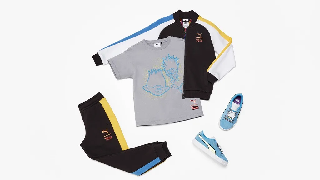 V kolekcii sa objavujú topánky značiek PUMA Myze, Suede a RS-X, ktoré sú zdobené postavami Trollov, ako sú Tiny Diamond a Queen Poppy, napríklad obrázkami postáv na šnúrkach na topánkach, ako aj chlpatými jazykmi, aby pripomínali účesy Trollov.Ale zábava nekončí pri teniskách. Táto kolekcia tiež obsahuje grafické tričká, tréningové bundy, tréningové nohavice a mikiny s okrúhlym výstrihom, ktoré sú zdobené ikonickými témami Trollov.