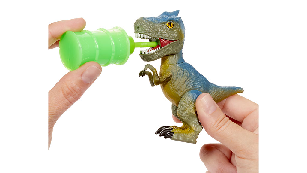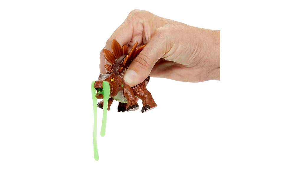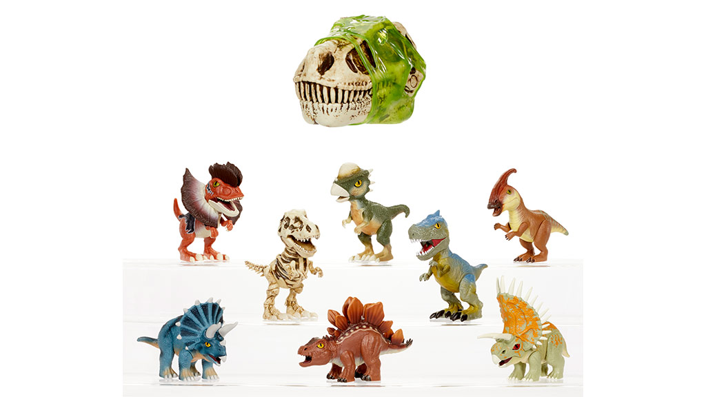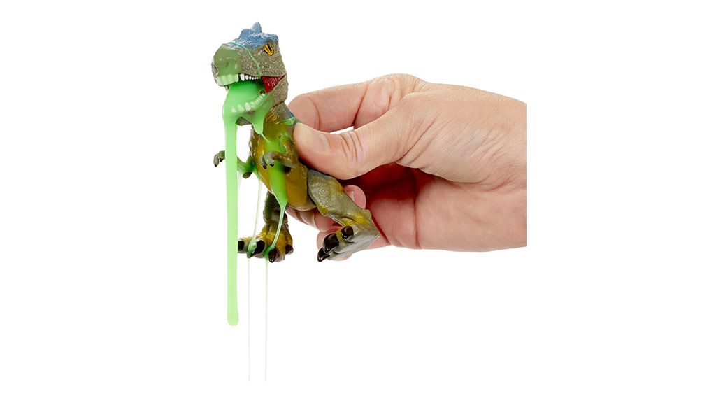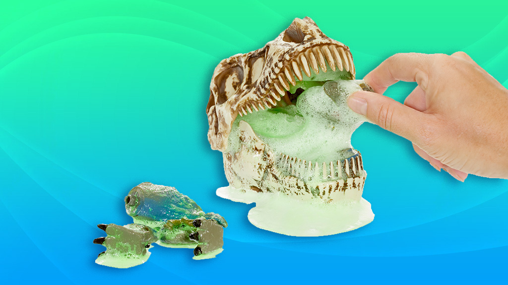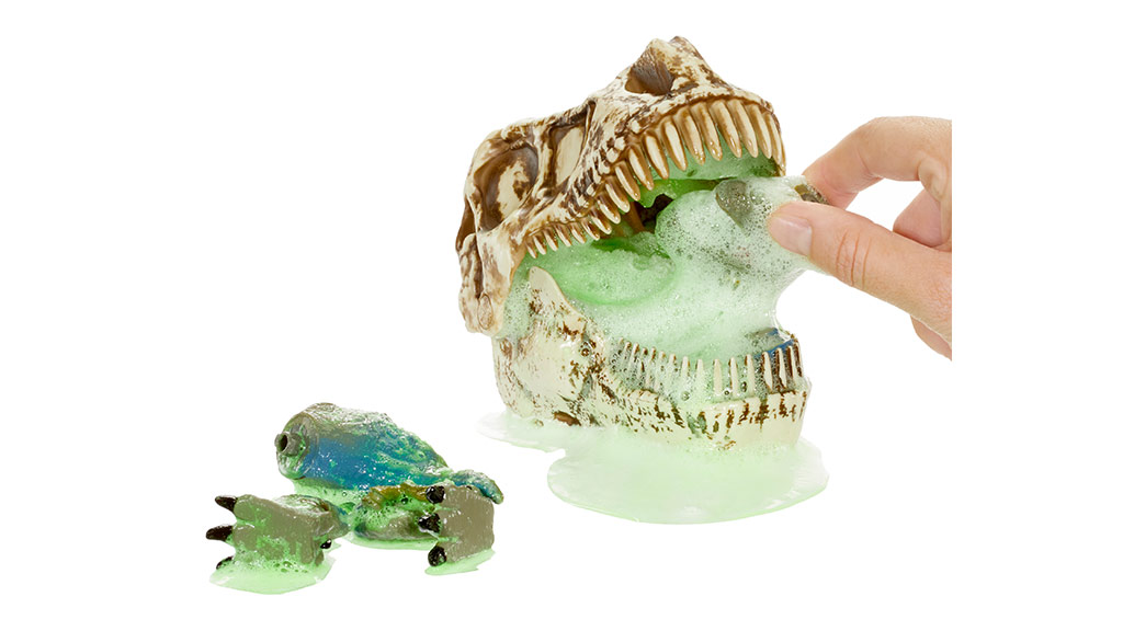 Deti môžu naliať vodu do tejto dinosaurej lebky, aby vytvorili penu a odhalili jednu zo šiestich skrytých dinosaurových figúrok! Deti môžu nakŕmiť priloženú dinosaurovu figúrku jedovatým slizom a dosiahnuť, aby zvracala, kakala alebo soplila.