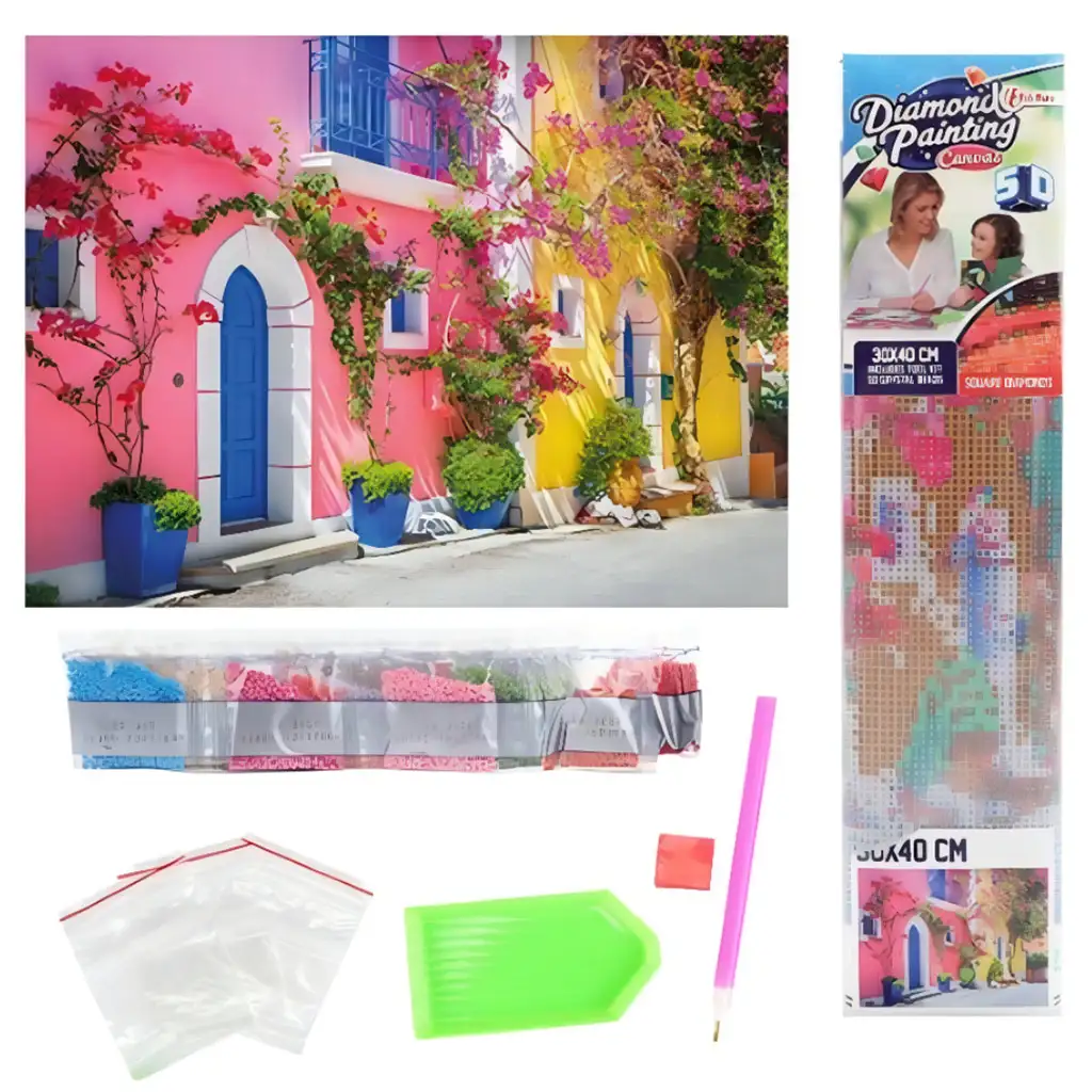 Súprava na maľovanie diamantov s názvom "Farby Grécka" ponúka farebnú a pôsobivú možnosť tvorby, ktorá prináša kúzlo gréckych ostrovov do vášho domova. Tento 30x40 cm diamantový obraz zobrazuje idylickú grécku ulicu, kde ožívajú domy v živých farbách, modré dvere a okná, ako aj nádherný pohľad na bugenvílie zdobiace steny. Obraz s vibrujúcimi odtieňmi ružovej, žltej a modrej evokuje slnečnú, stredomorskú atmosféru Grécka, ktorá očarí každého.