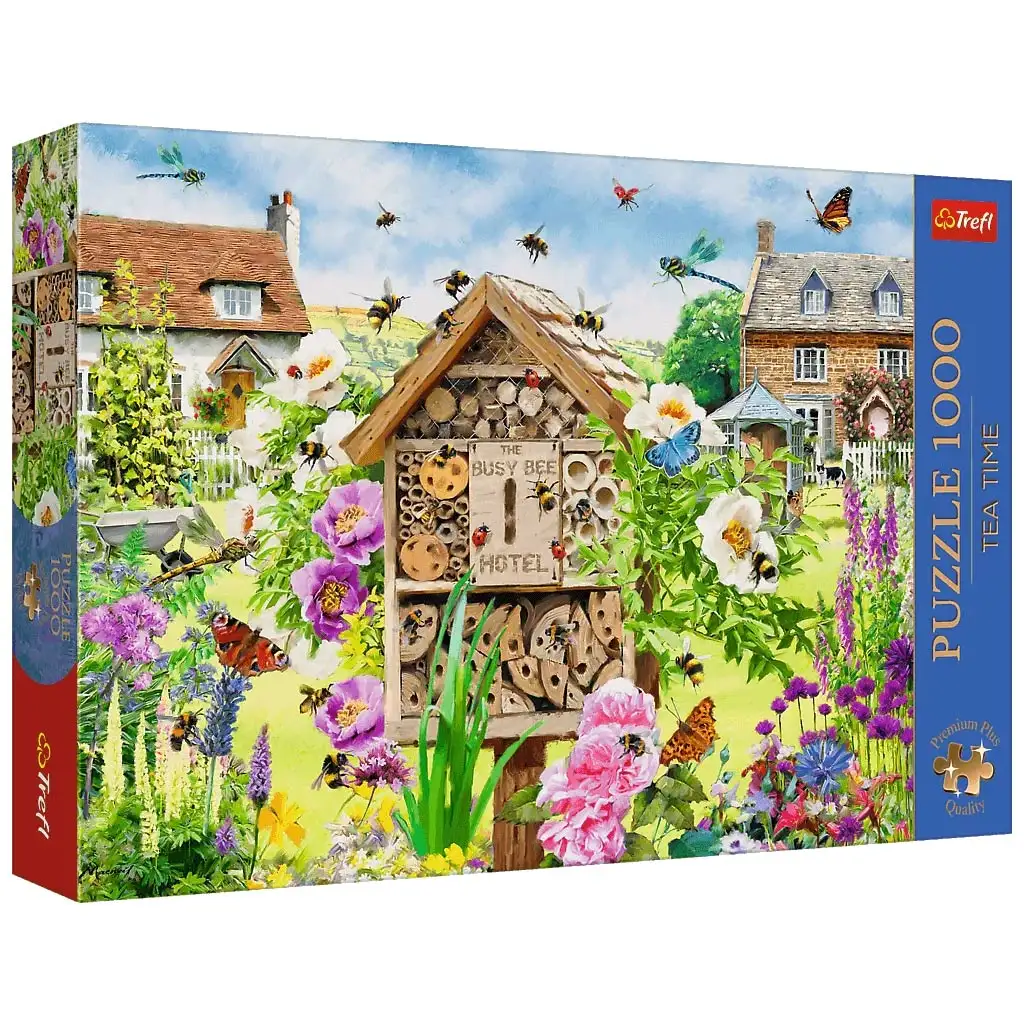 Ponorte sa do idylickej, kvetmi rozvoniavajúcej letnej záhrady, kde včely usilovne poletujú medzi farebnými kvetmi! Puzzle „Bzučiaca záhrada – Ríša včielok a kvetov“ so 1000 dielikmi zachytáva malebnú scenériu, v ktorej ožíva úžasný svet prírody. V centre diania stojí malý včelí hotel, ozdobený nápisom „The Busy Bee Hotel“. Okolo neho sa hemžia kvety, včely, motýle a ďalší hmyz – skutočný zážitok pre milovníkov prírody!